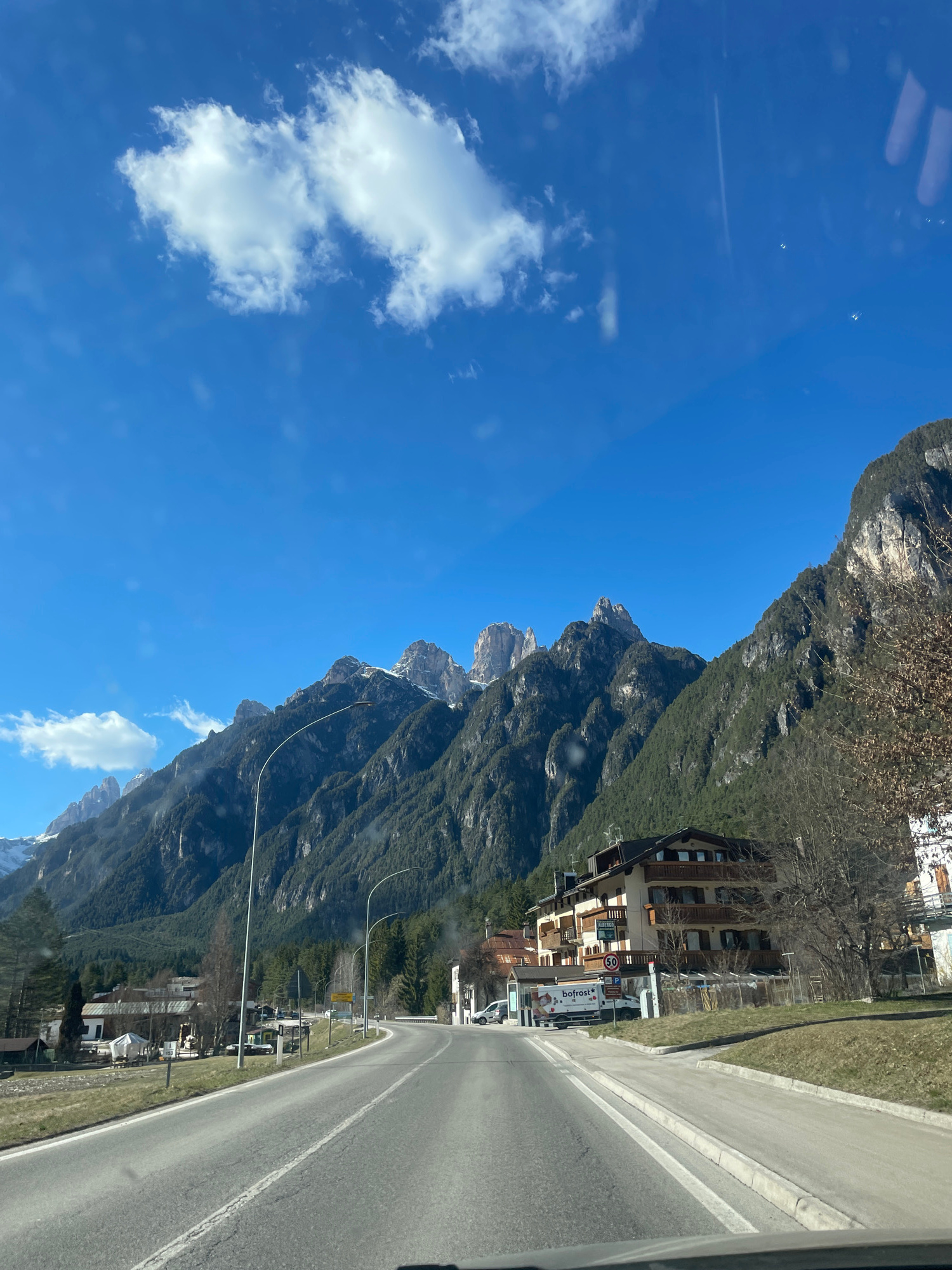 Auronzo di Cadore, Italy: A slightly angled shot shows a road curving to the right, bordered by green grass and a building to its right. Light posts line the road. To the left, a mountain range rises…read more