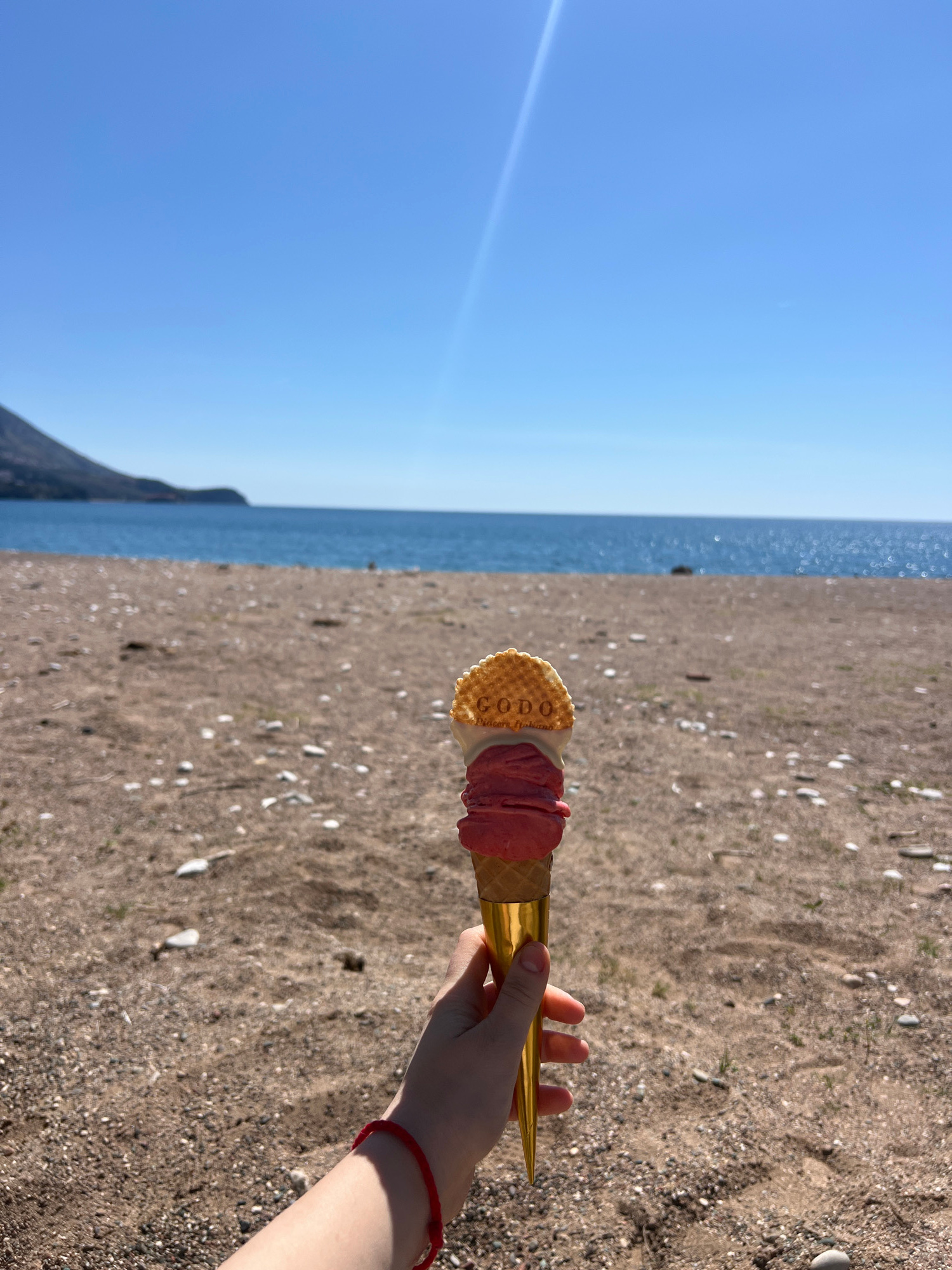 A person is holding an ice cream cone on a beach. The ice cream is pink and white, in a cone that appears to be partially wrapped in gold foil. The person's hand and a red bracelet are visible. The ba…read more