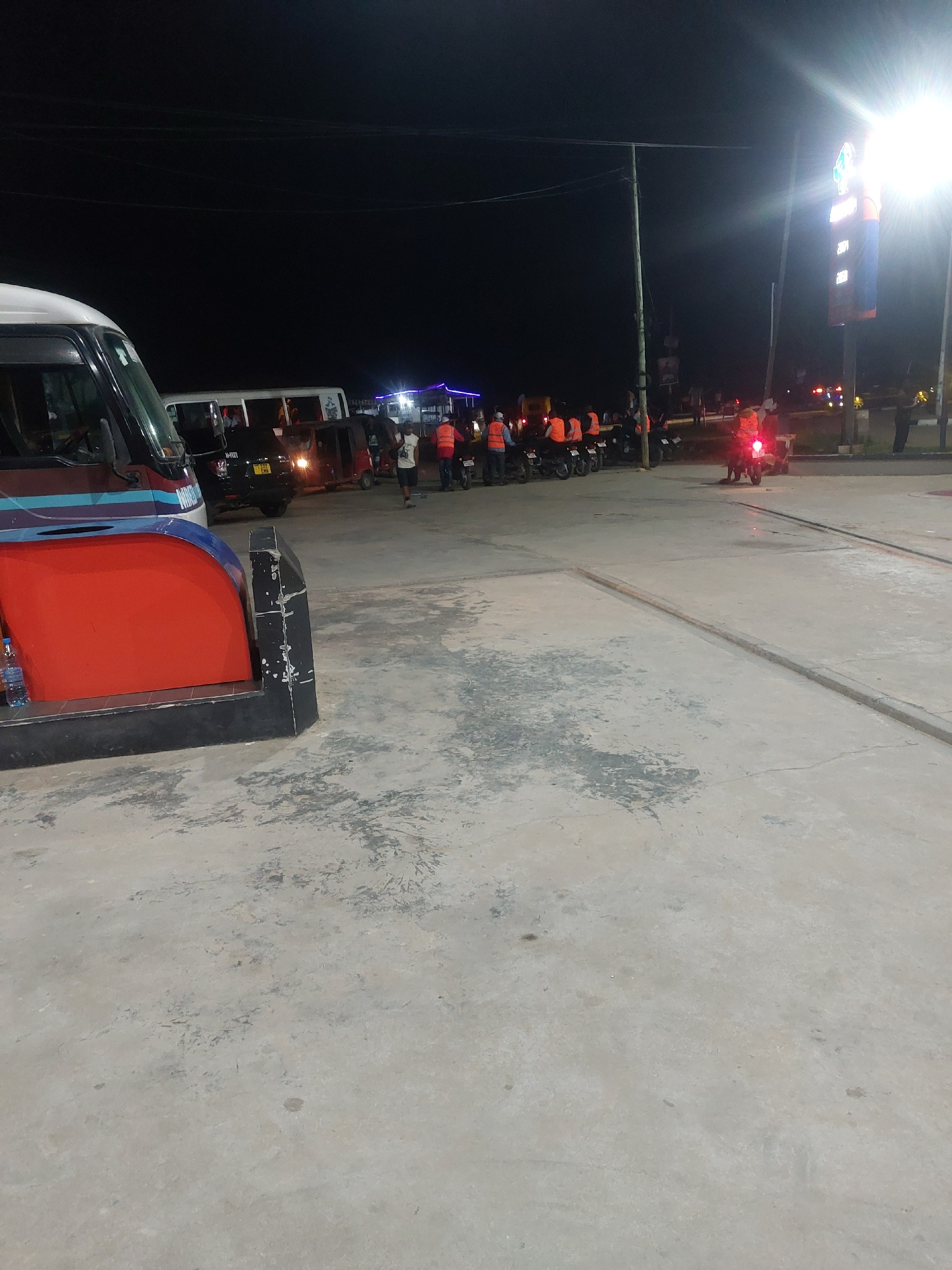 The image depicts a scene at night in Dar es-Salaam, Tanzania. A line of "bodaboda" drivers (motorcycle taxis) wearing orange vests are gathered near a traffic light showing red. The drivers are waiti…read more