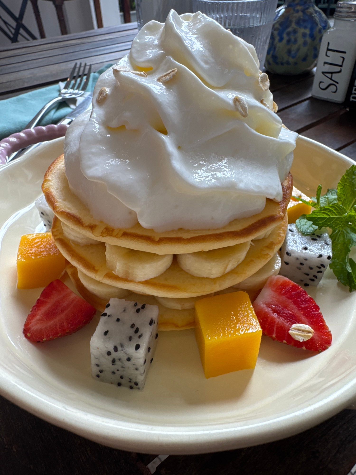 The image shows a plate of pancakes topped with a large dollop of whipped cream, arranged with slices of banana between the pancakes. Cubes of mango and dragon fruit, along with sliced strawberries, g…read more