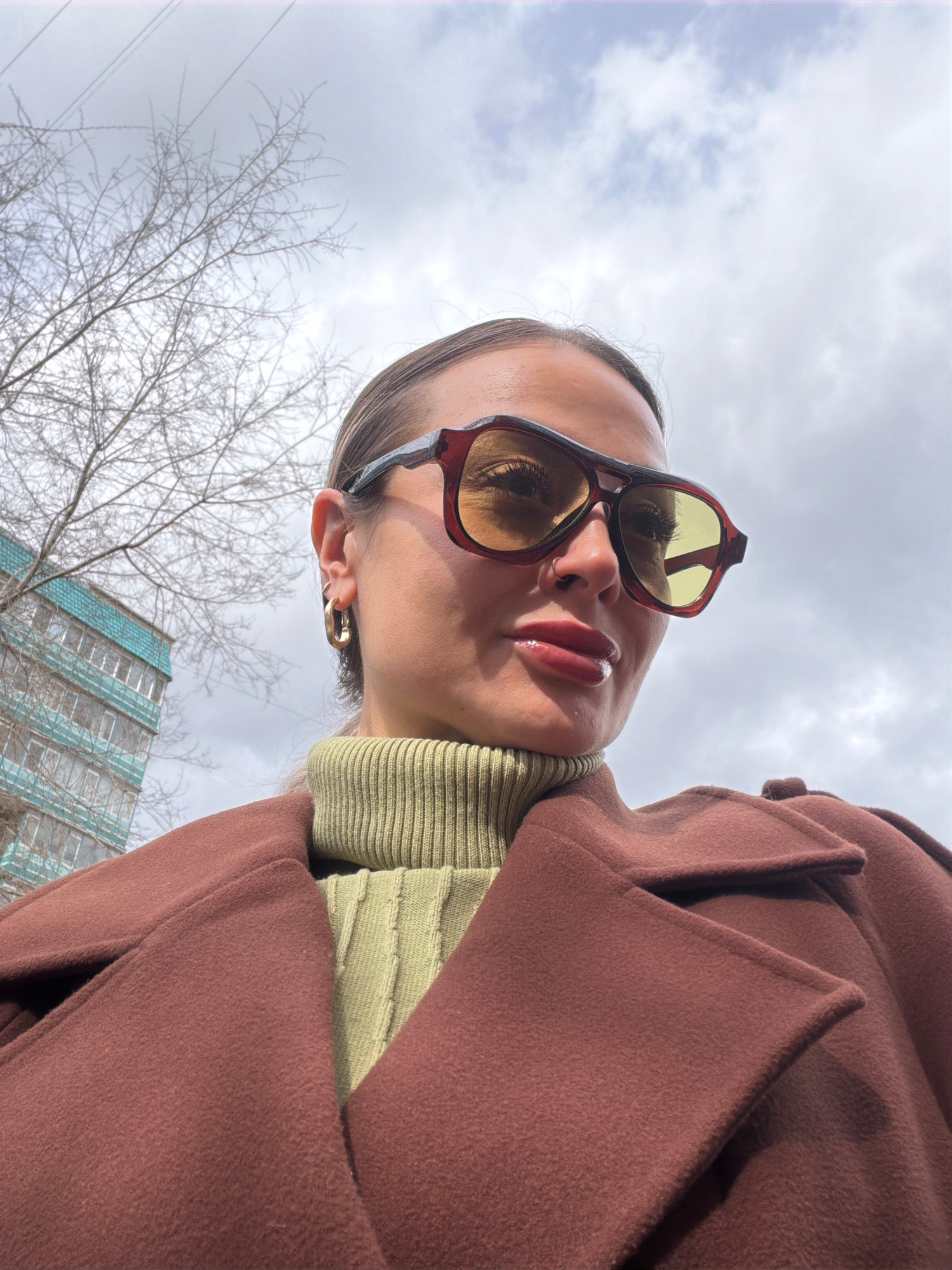 A woman wearing sunglasses, a green turtleneck sweater, and a brown coat is the main subject of the image. She is positioned in front of a building with blue and white horizontal stripes, suggesting a…read more