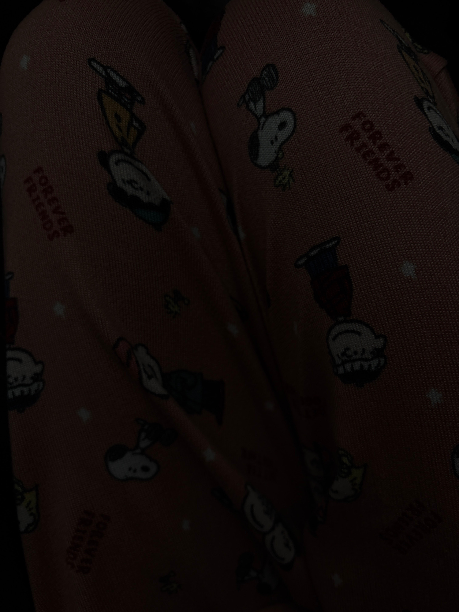 The image shows a close-up of fabric with a pattern featuring characters from the Peanuts comic strip, including Snoopy and Charlie Brown. The phrase "FOREVER FRIENDS" is also printed on the fabric. T…read more