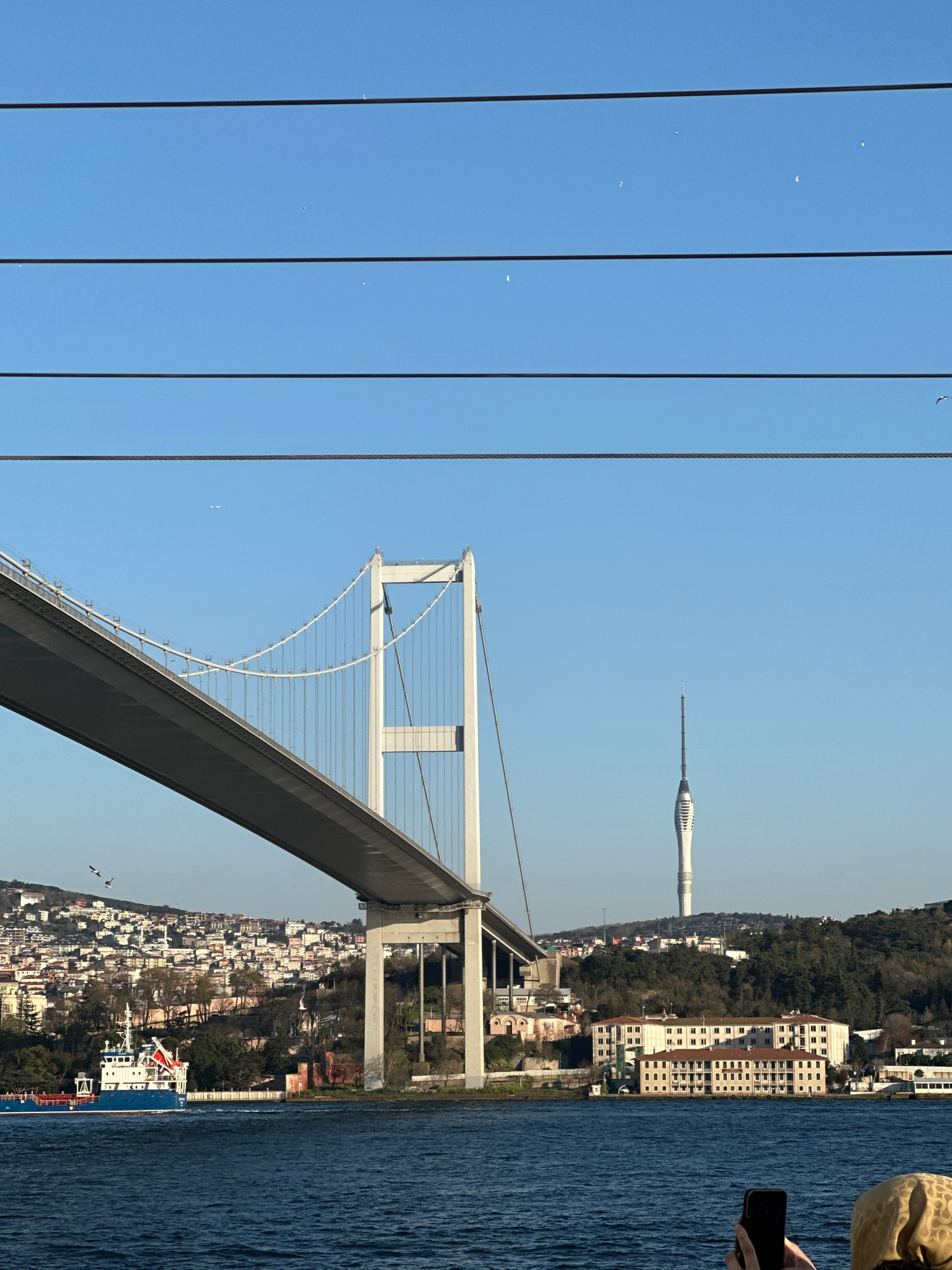 The image shows the Bosphorus Bridge in Istanbul, Turkey, with the city of Beşiktaş visible on the shoreline. In the background, the Camlica Tower stands tall. The bridge's support towers and suspensi…read more