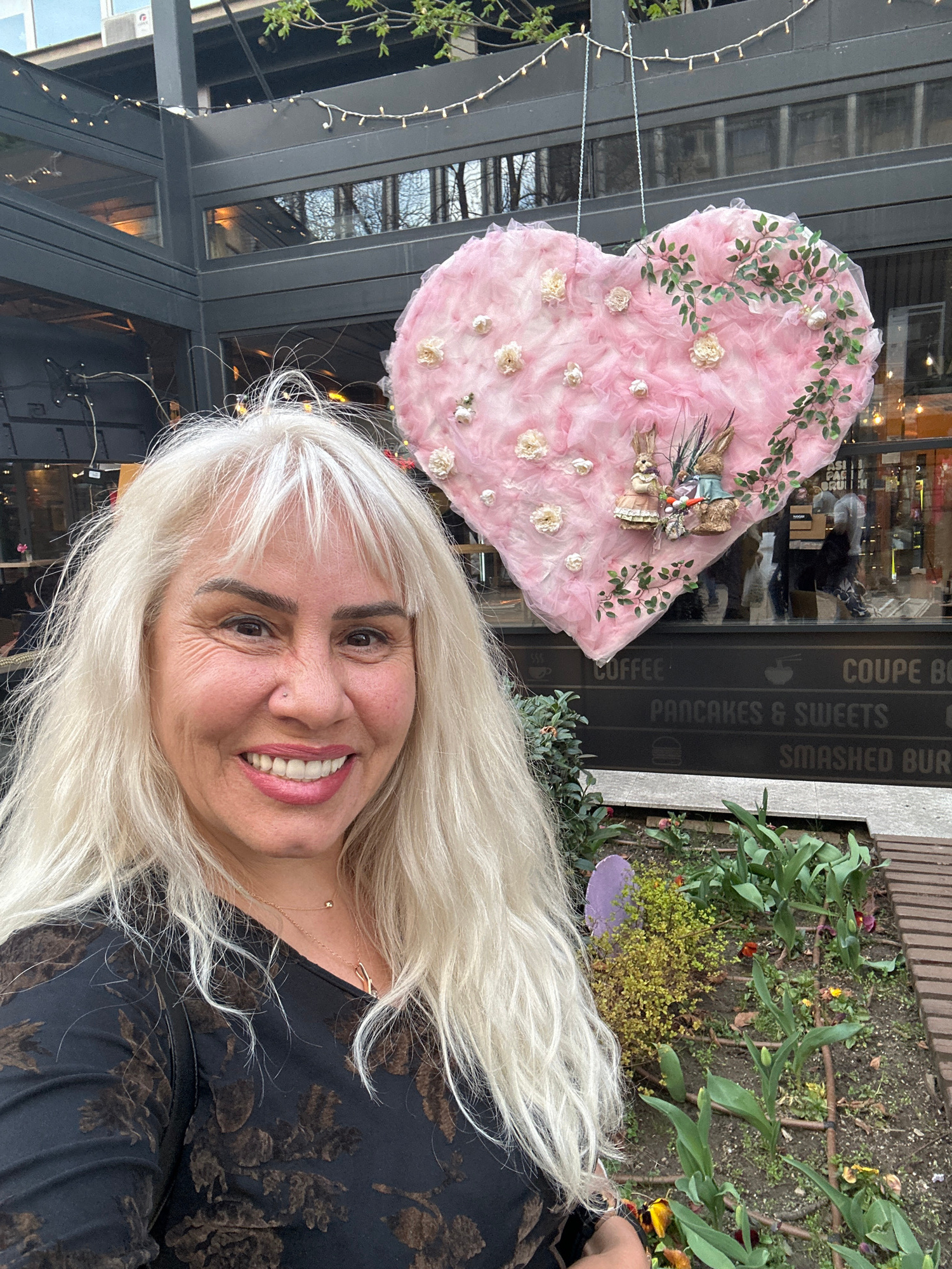 A woman with long white hair is smiling at the camera. Behind her is a large, pink heart-shaped decoration adorned with white flowers and greenery, attached to a pole with string lights. Further in the background, there is a building with large windows and a sign indicating "COFFEE PANCAKES & SWEETS SMASHED BURGER." Next to the building, there is a small garden bed with various green plants and flowers. The photograph appears to be taken outdoors during the daytime. Given the sign's reference to food and the architectural style of the building, the location may be near a restaurant or cafe. Without additional clues, the specific location in Sofia, Bulgaria cannot be definitively determined. | Open Wire