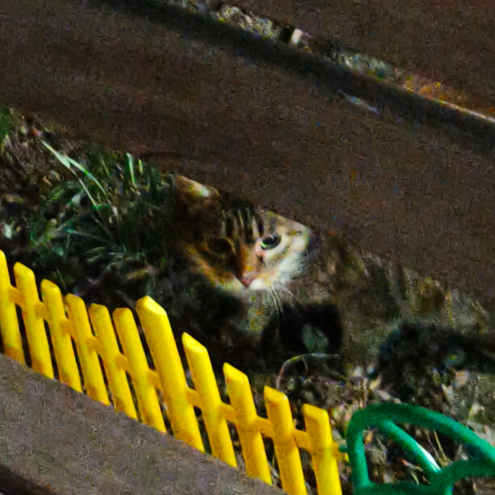 A cat lies amidst foliage behind a yellow plastic fence and a green plastic handle. The location is Hrodna, Belarus.