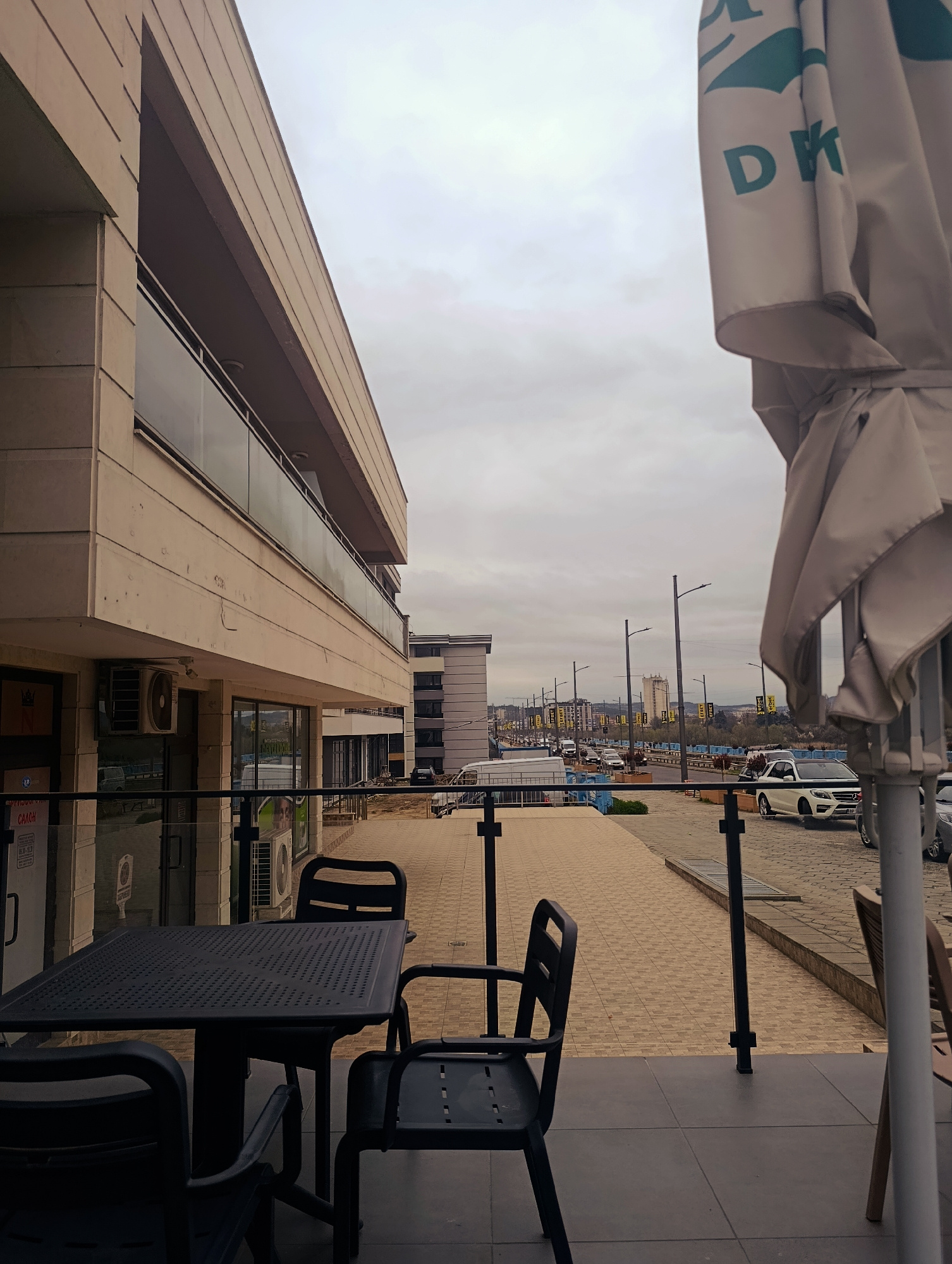 The image depicts an outdoor seating area of a café or restaurant located in Kardzhali, Bulgaria. A black square table with three chairs sits on a gray tiled patio in the foreground. A partially folde…read more