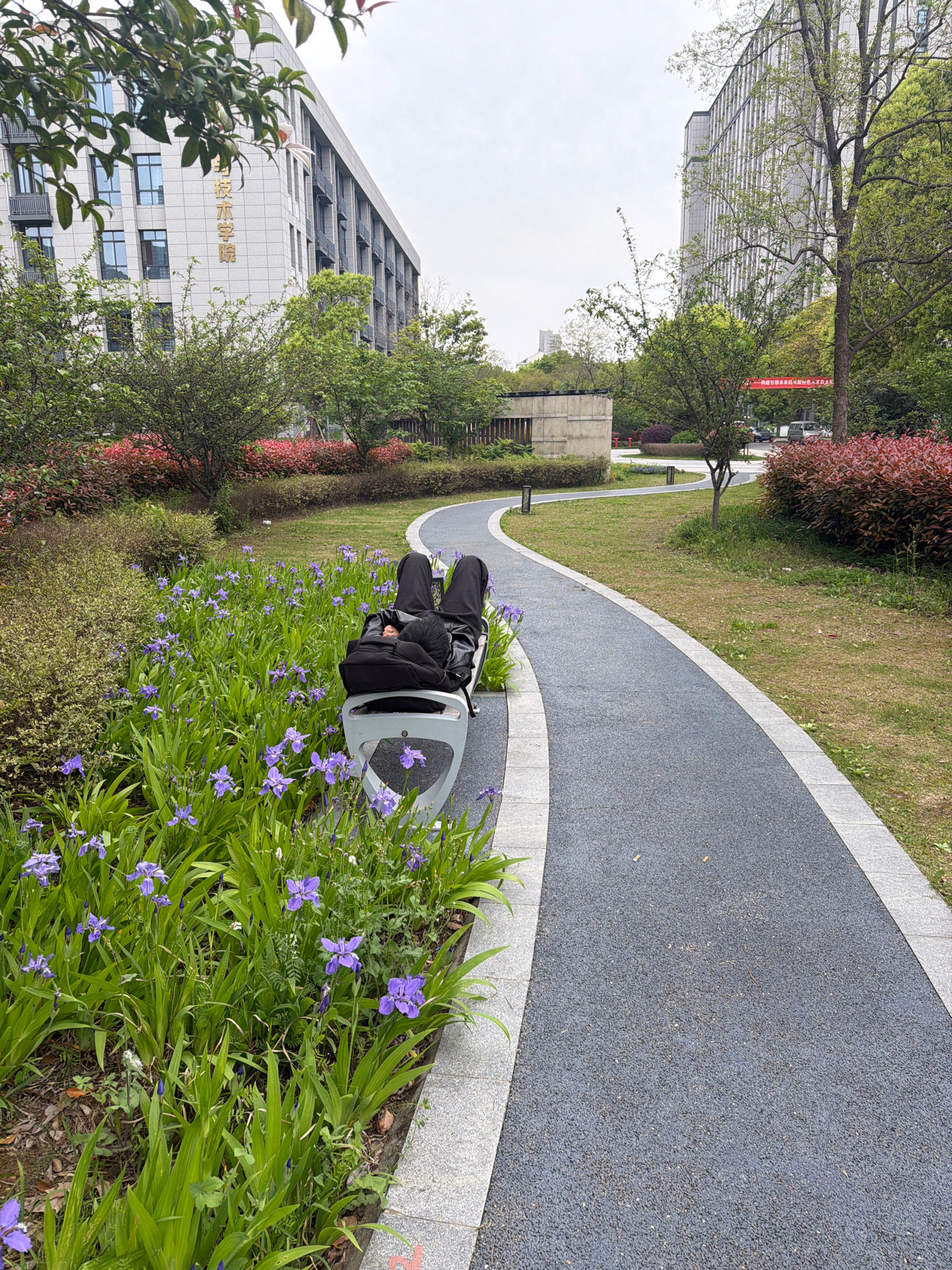 A person is sitting on a light-colored bench along a curved paved path in a park-like area of Jiangning District, China. The individual is wearing black clothing and has a black backpack next to them.…read more
