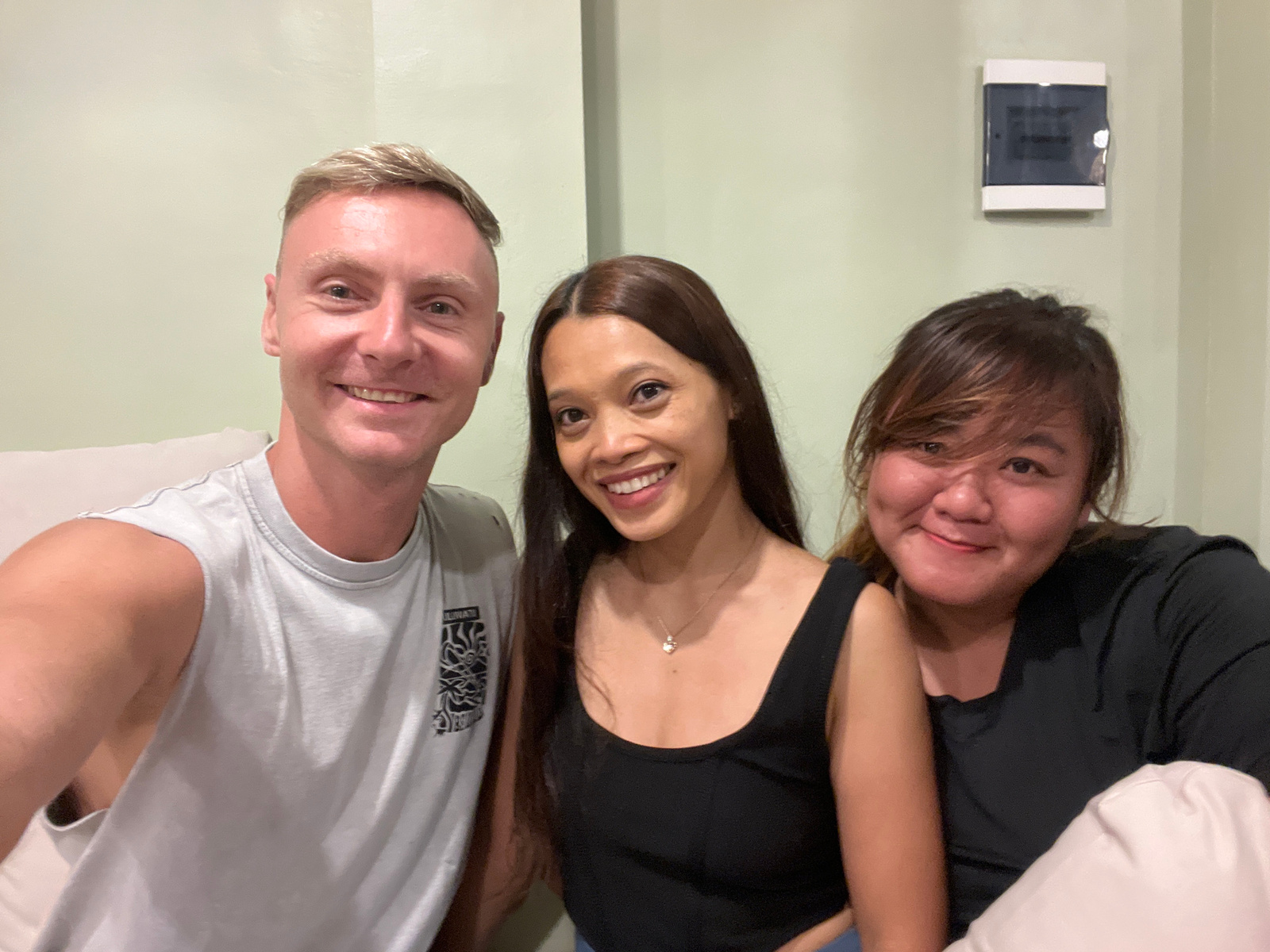 Three people are posing closely together. The person on the left has brown hair and is wearing a black top. The person in the middle has long dark hair and is wearing a black tank top with a silver ne…read more