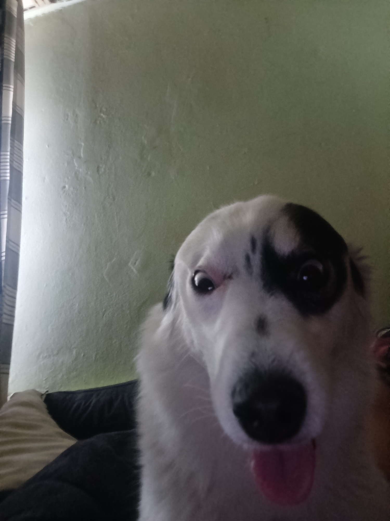 A close-up shot of a dog with white and black fur is presented against a background of a light-colored wall and curtains. The dog's tongue is visible, and it appears to be looking directly at the came…read more