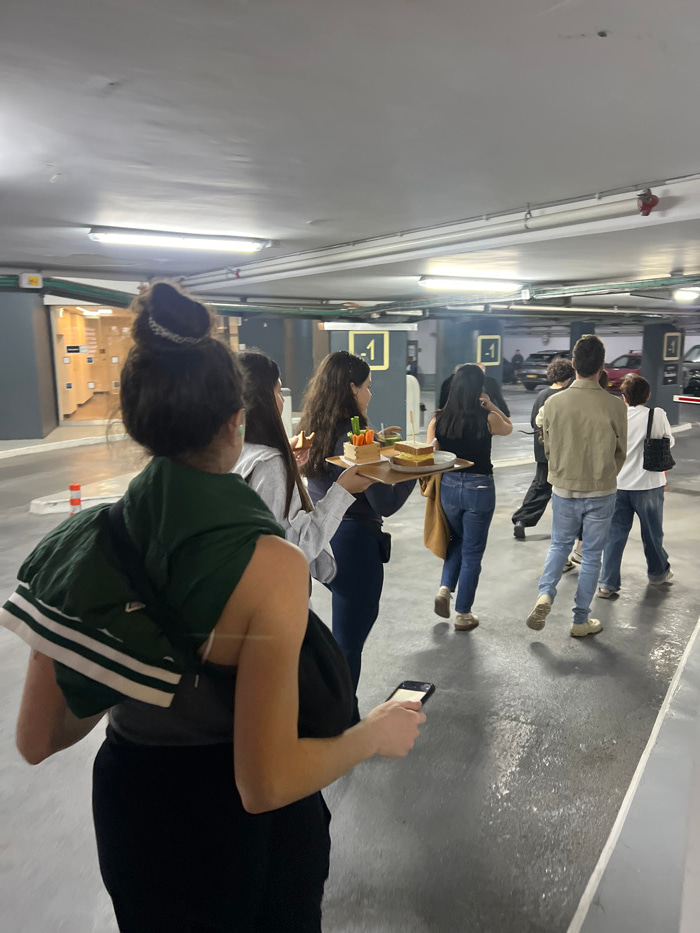 The image depicts a group of approximately eight individuals walking through a brightly lit underground parking garage, identified as level -1, in Tel-Aviv, Israel. The environment features a grey con…read more