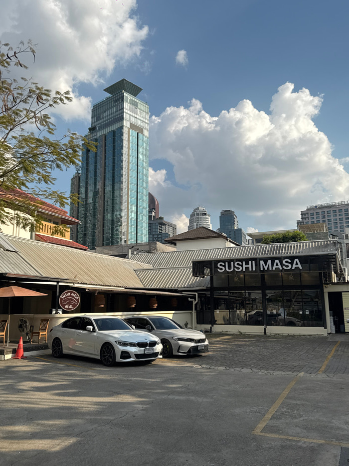 An outdoor daytime photograph depicts a scene in Bangkok, Thailand, centered on the Sushi Masa restaurant. The foreground consists of a paved parking area with visible yellow demarcation lines. Two wh…read more