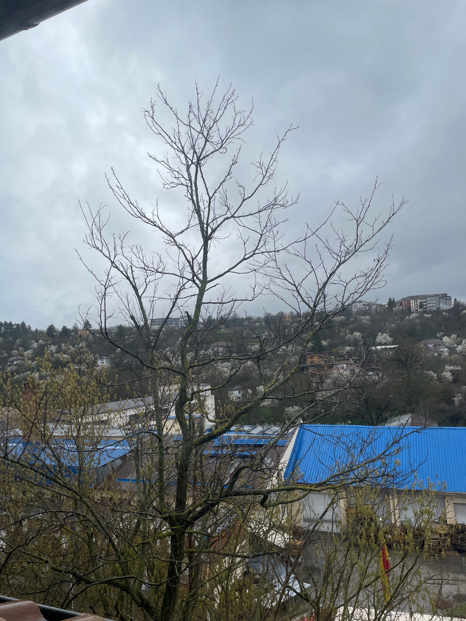 The image shows a view from an elevated position, possibly a balcony or high window, in what appears to be a hilly urban area. In the foreground, there are two trees, one mostly bare with intricate br…read more