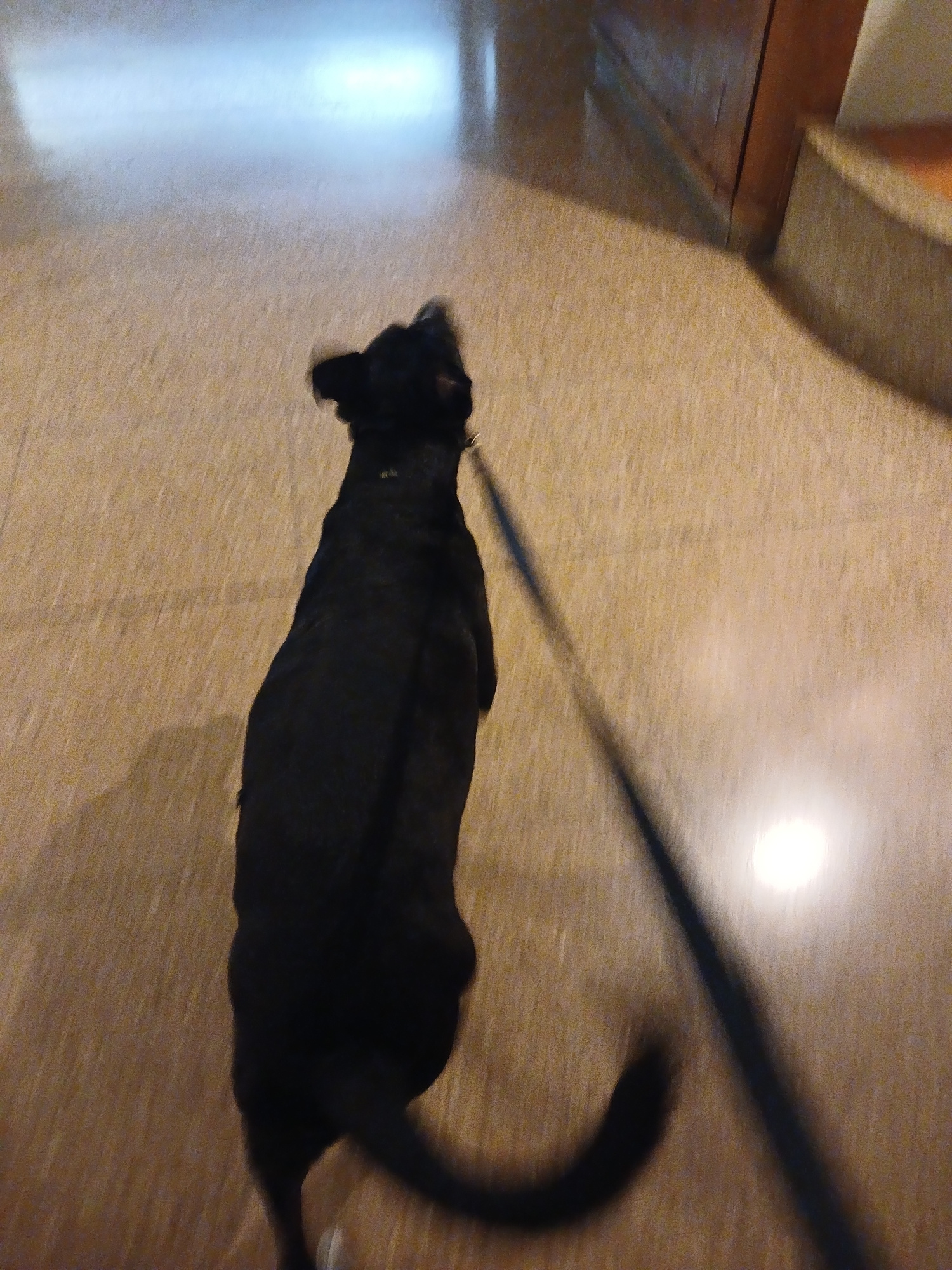 An overhead shot, rotated clockwise, captures a black dog walking on a light-colored floor, possibly indoors in Buenos Aires. The dog is positioned horizontally across the frame, moving from left to r…read more