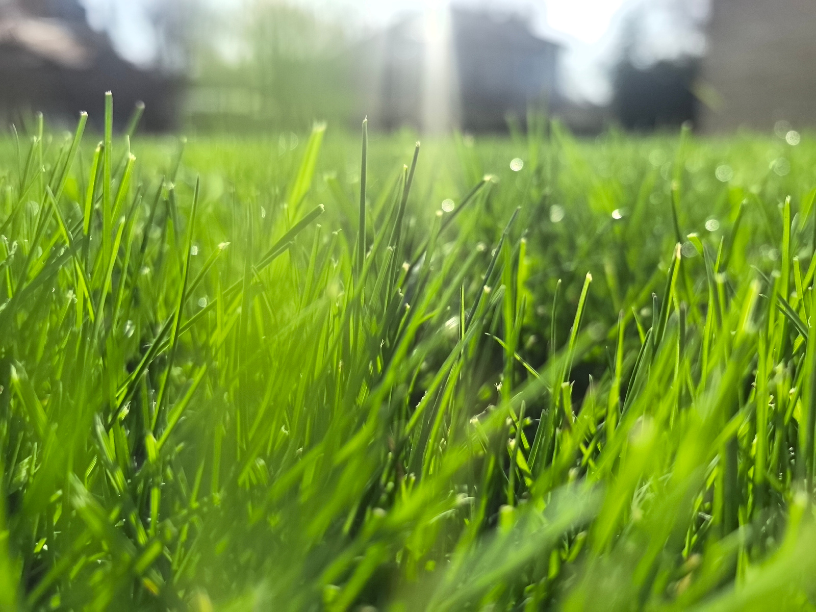 The image shows a close-up view of green grass, possibly a lawn, with blades of grass in sharp focus in the foreground. Out-of-focus structures, likely buildings or houses, are visible in the backgrou…read more