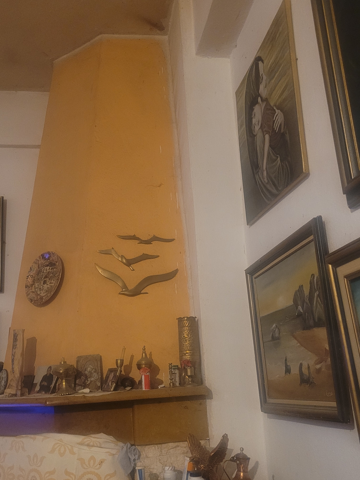 The image displays a room interior, likely a living space, featuring a wall painted in a light orange hue. Attached to the wall are decorative elements including metal bird sculptures and a patterned…read more