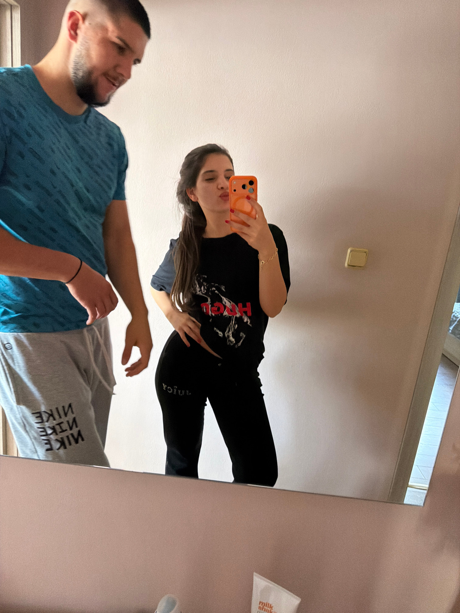 A man and a woman are seen in a mirror selfie. The woman is holding a phone and taking the picture. She is wearing a black t-shirt and black pants. The man is wearing a blue t-shirt and grey sweatpant…read more