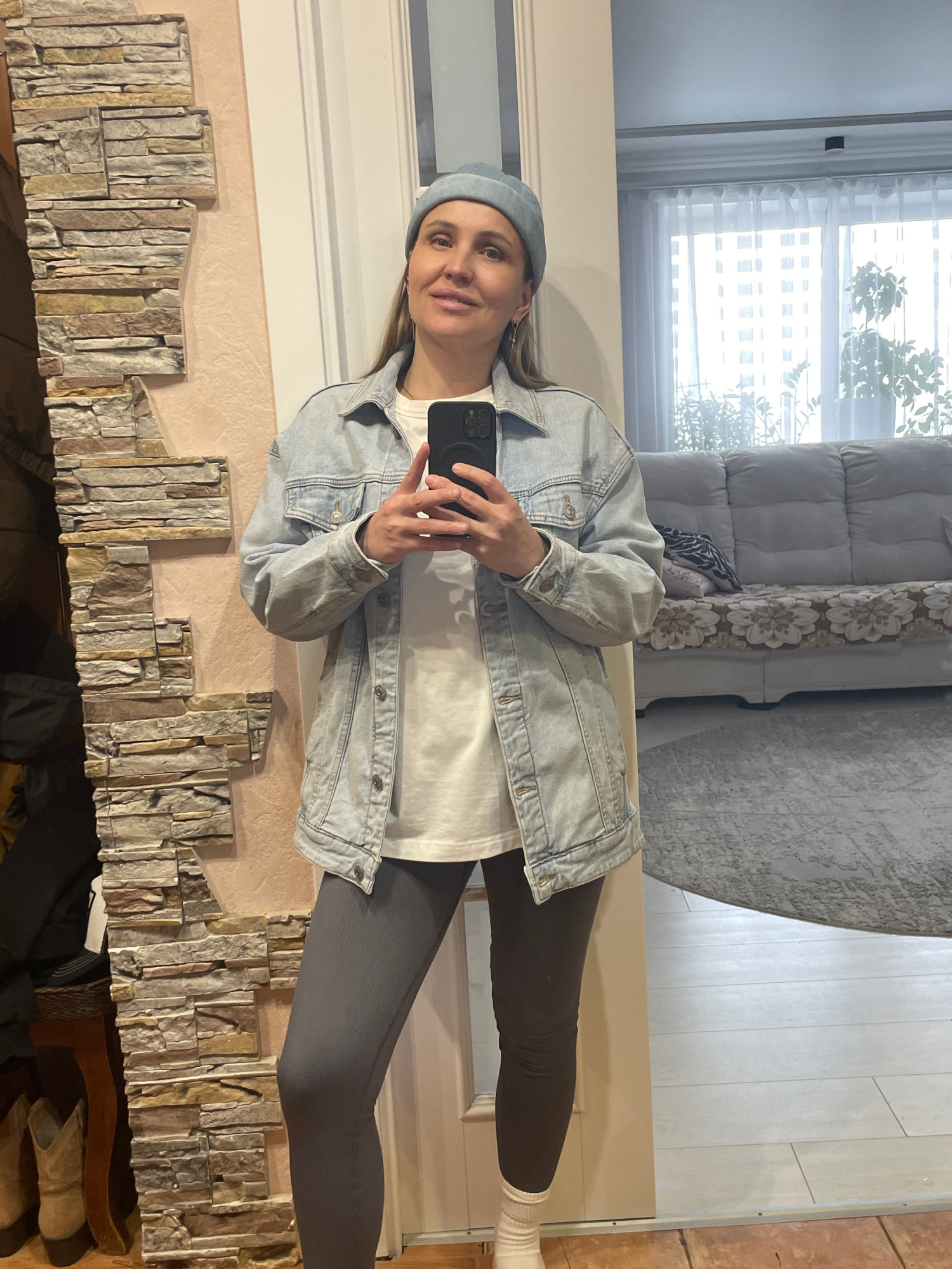A young woman wearing a light blue hat and denim jacket, a white t-shirt, and gray leggings is taking a selfie in a room with a mirror. The mirror reflects a couch, a window with curtains, and a wall…read more