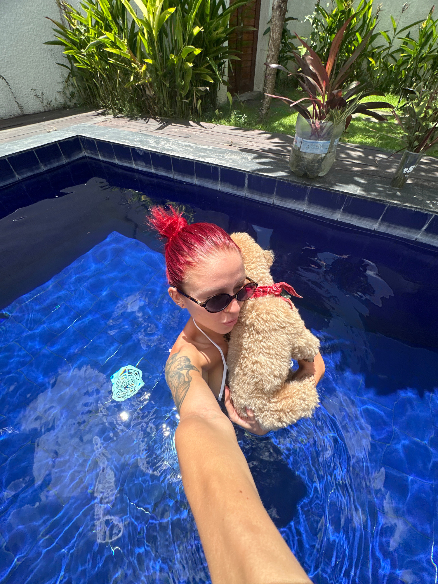 A person with red hair and sunglasses is holding a light brown poodle dog in a blue tiled pool. The person is wearing a white top and has a tattoo on their arm. The pool is surrounded by green plants…read more