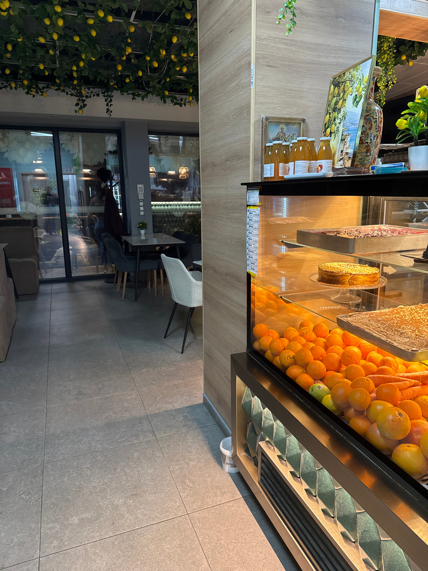 The image captures the interior of a commercial establishment, likely a juice bar or cafe, situated in Sevlievo, Bulgaria. To the right, a glass display case presents a variety of items. Fresh orange…read more