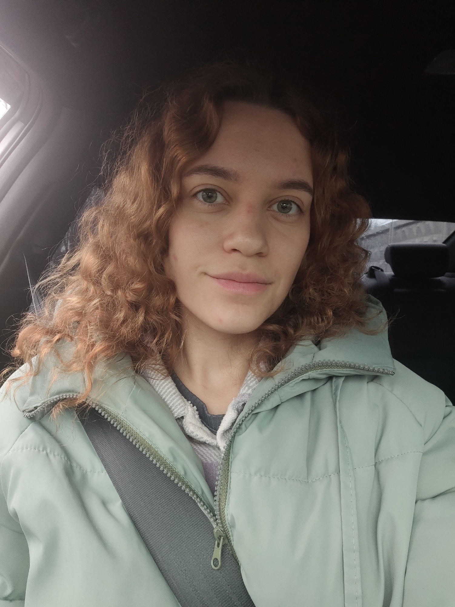 A woman with curly red hair is sitting in a car, wearing a light green puffer jacket with the seatbelt fastened. The car's interior is mostly dark, with the black ceiling visible. The woman has fair s…read more