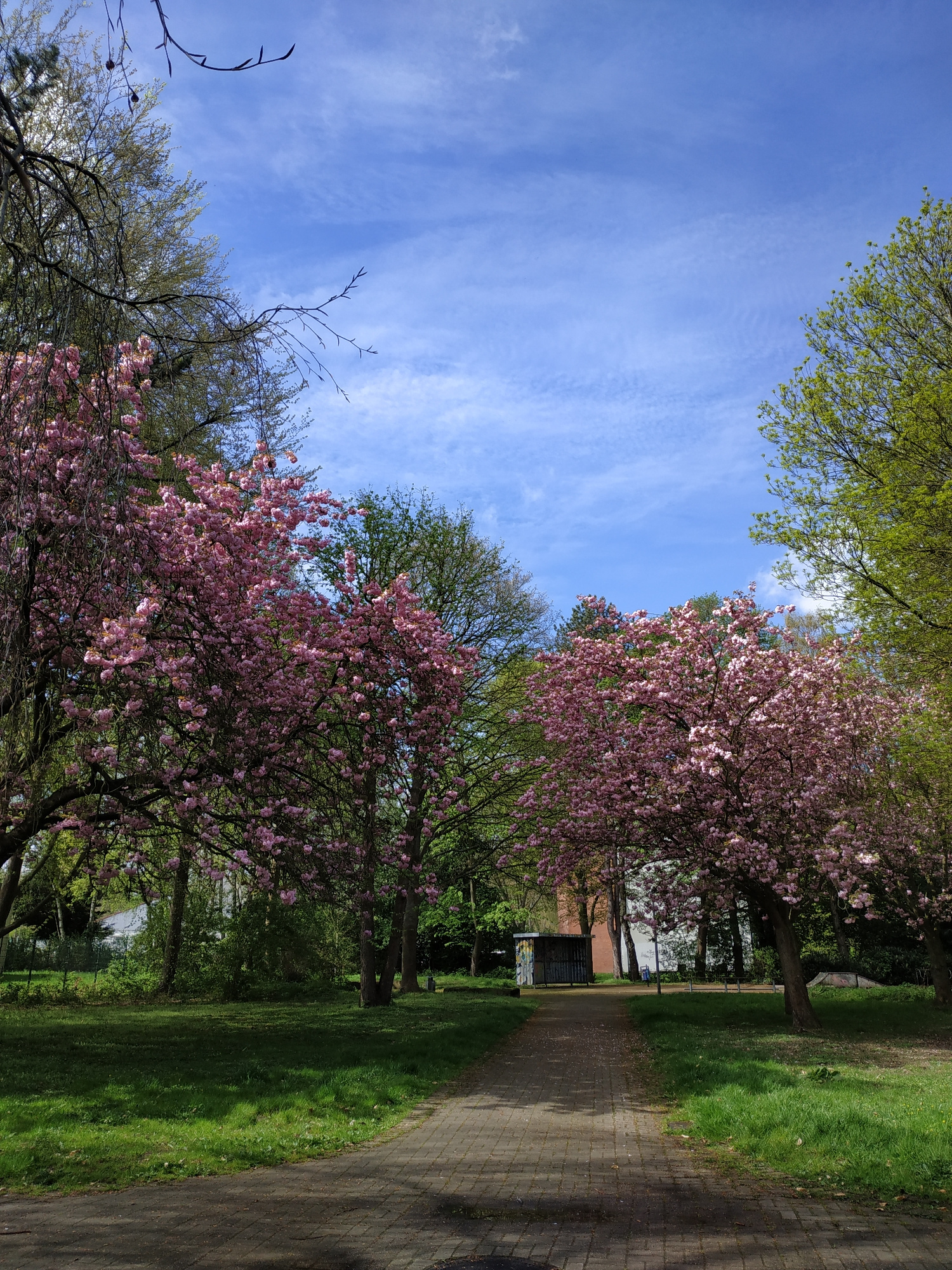 The image depicts a park scene in Dortmund, Germany, characterized by a vibrant display of cherry blossoms in full bloom. A paved walkway curves through the park, bordered by lush green grass. Trees l…read more