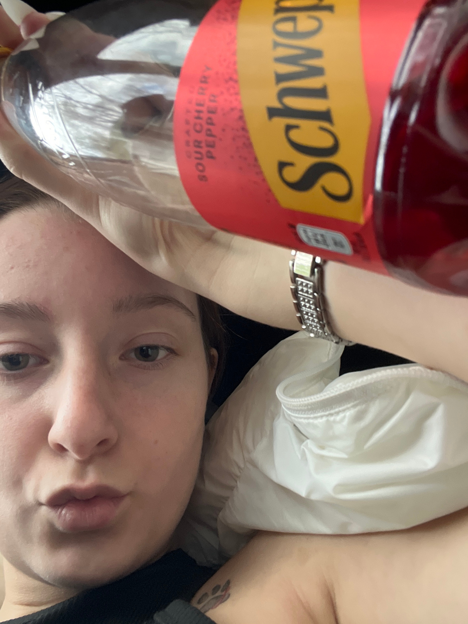 The image shows a person holding a bottle of Schweppes Crafted Sour Cherry Pepper in their left hand. The person is lying down, possibly on a bed, with a white puffy material (likely a jacket or blankβ¦read more