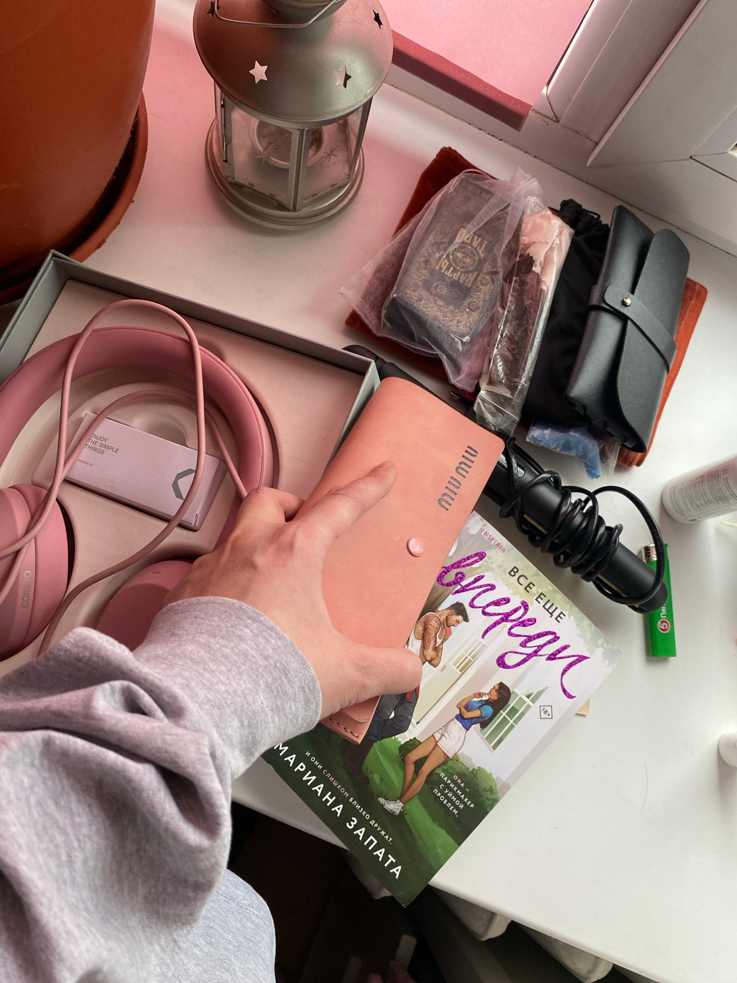 A high-angle shot captures a cluttered scene, likely on a table or surface near a window. The composition includes an assortment of personal items: a black leather glasses case, a deck of tarot cards…read more