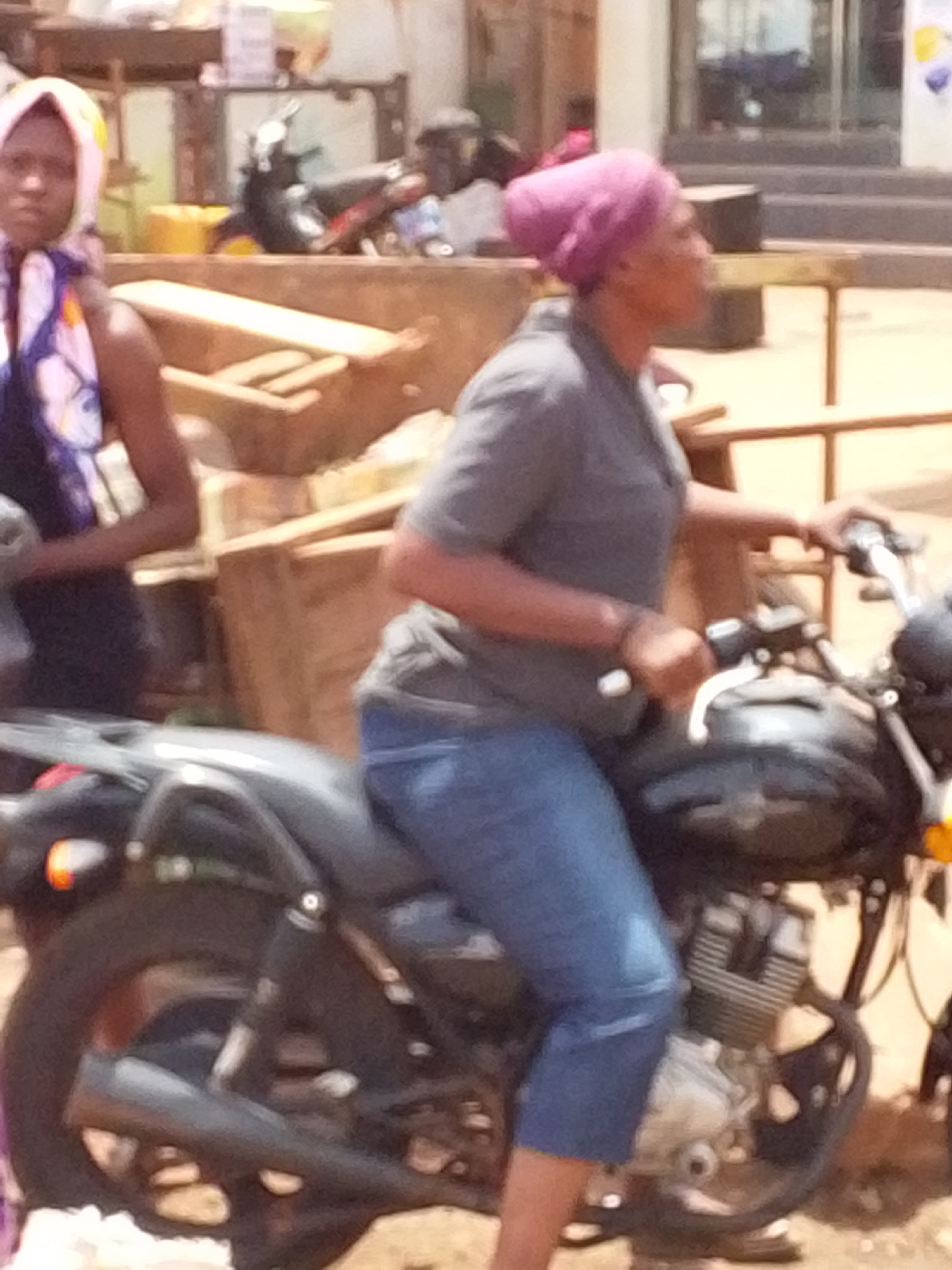 The image depicts two individuals and a motorcycle in an outdoor setting, likely a street in Tamale, Ghana. The primary subject is a woman wearing a purple headwrap, a grey short-sleeved shirt, and bl…read more