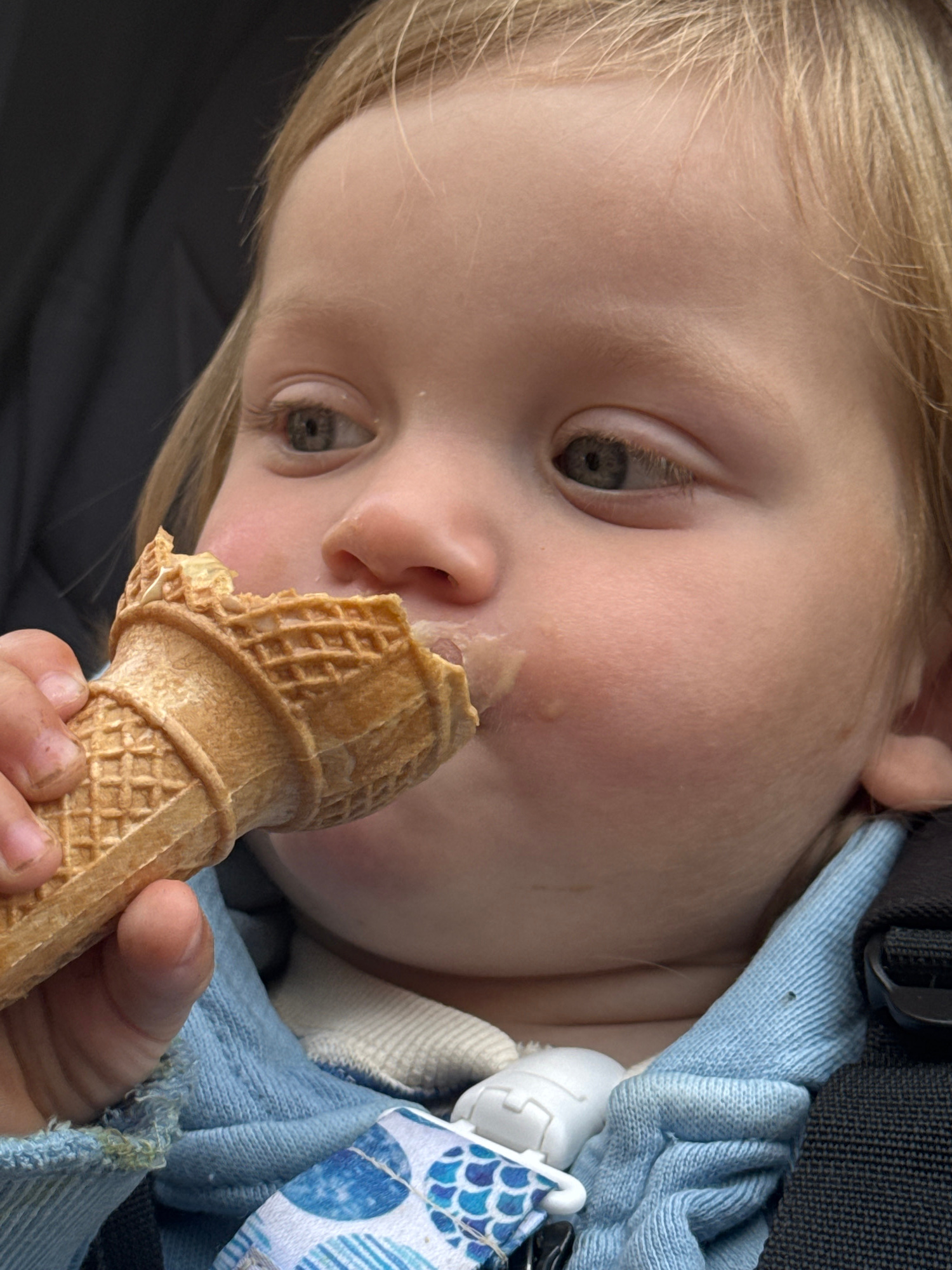 A young child with blond hair and light skin is eating an ice cream cone. The child is wearing a blue hooded sweatshirt and appears to be in a stroller or baby carrier, as evidenced by the black strapβ¦read more