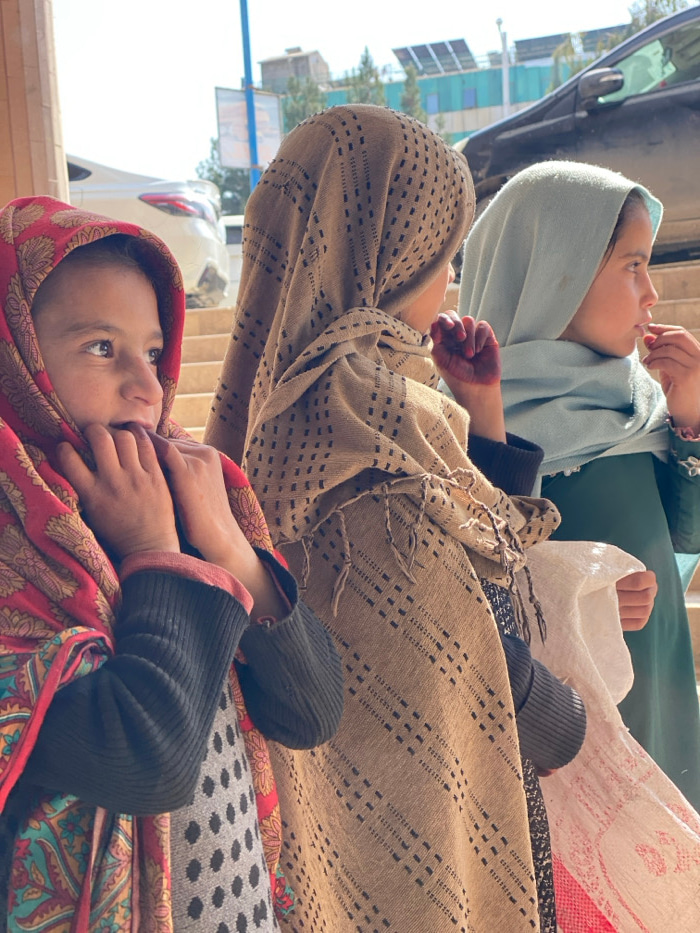 Three young girls are depicted standing in a street scene in Kandahar, Afghanistan, under bright daylight. The girl on the left, viewed in a three-quarter profile facing slightly right and upwards, we…read more
