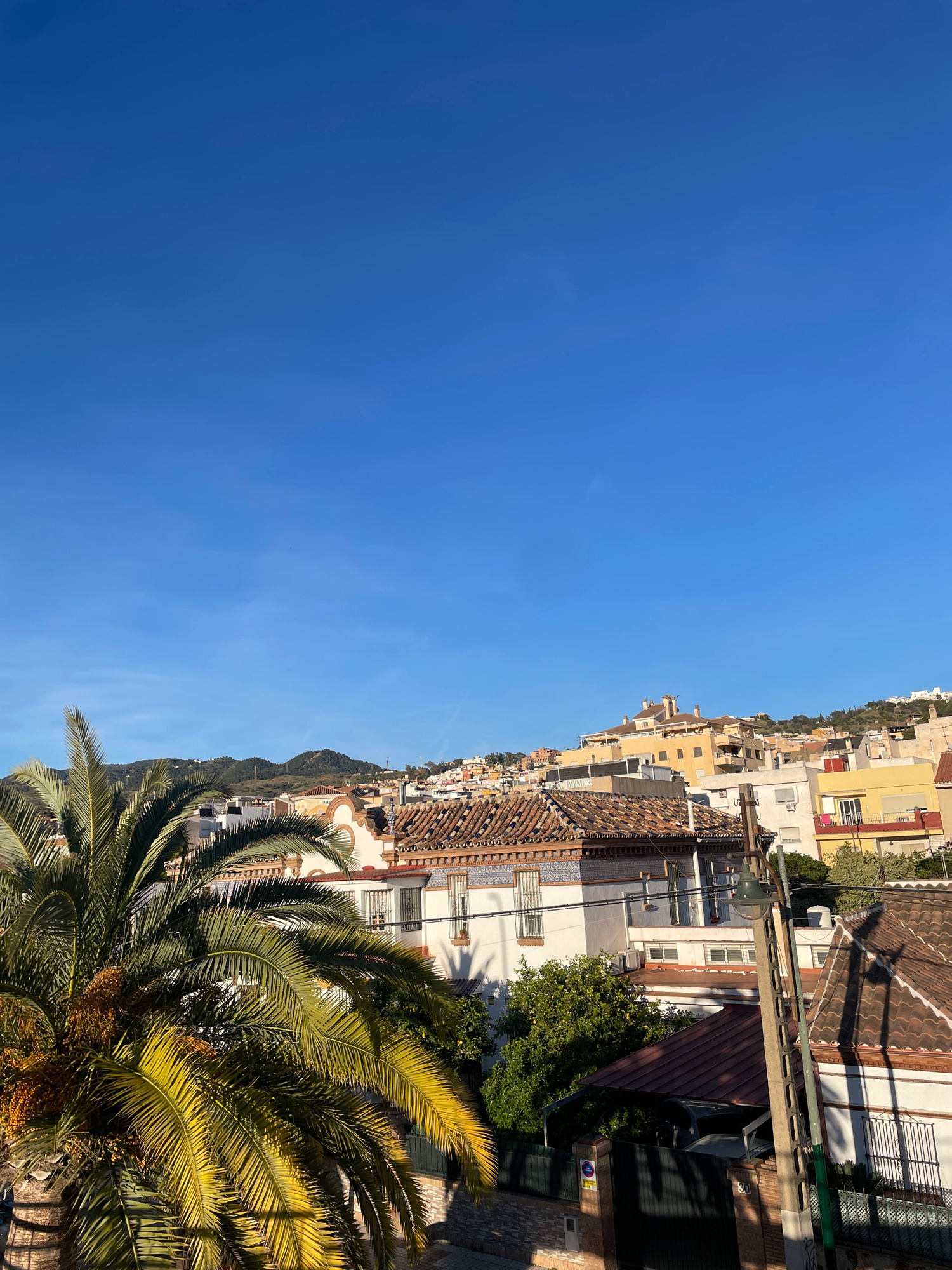 The image captures a bright, sunny day in Málaga, Spain. The foreground features the top of a large palm tree with dense, vibrant green fronds. Behind the palm tree, the cityscape of Málaga unfolds, m…read more