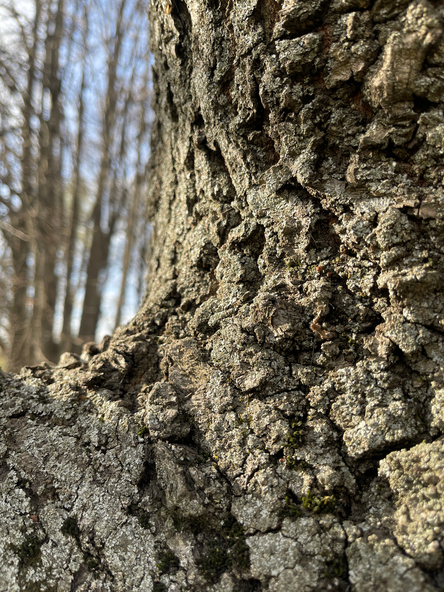 This media file is a close-up, high-detail photograph of heavily textured tree bark. The bark, primarily gray-brown, is covered in extensive patches of pale grey-green lichen and small specks of green…read more