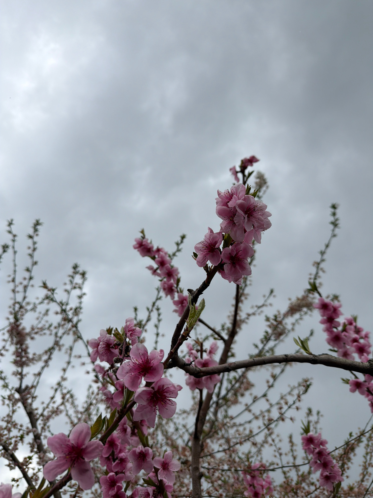 The image captures a low-angle view of a flowering tree, its branches adorned with pink blossoms. The backdrop is a cloudy sky, suggesting overcast weather conditions. The tree's branches extend diago…read more