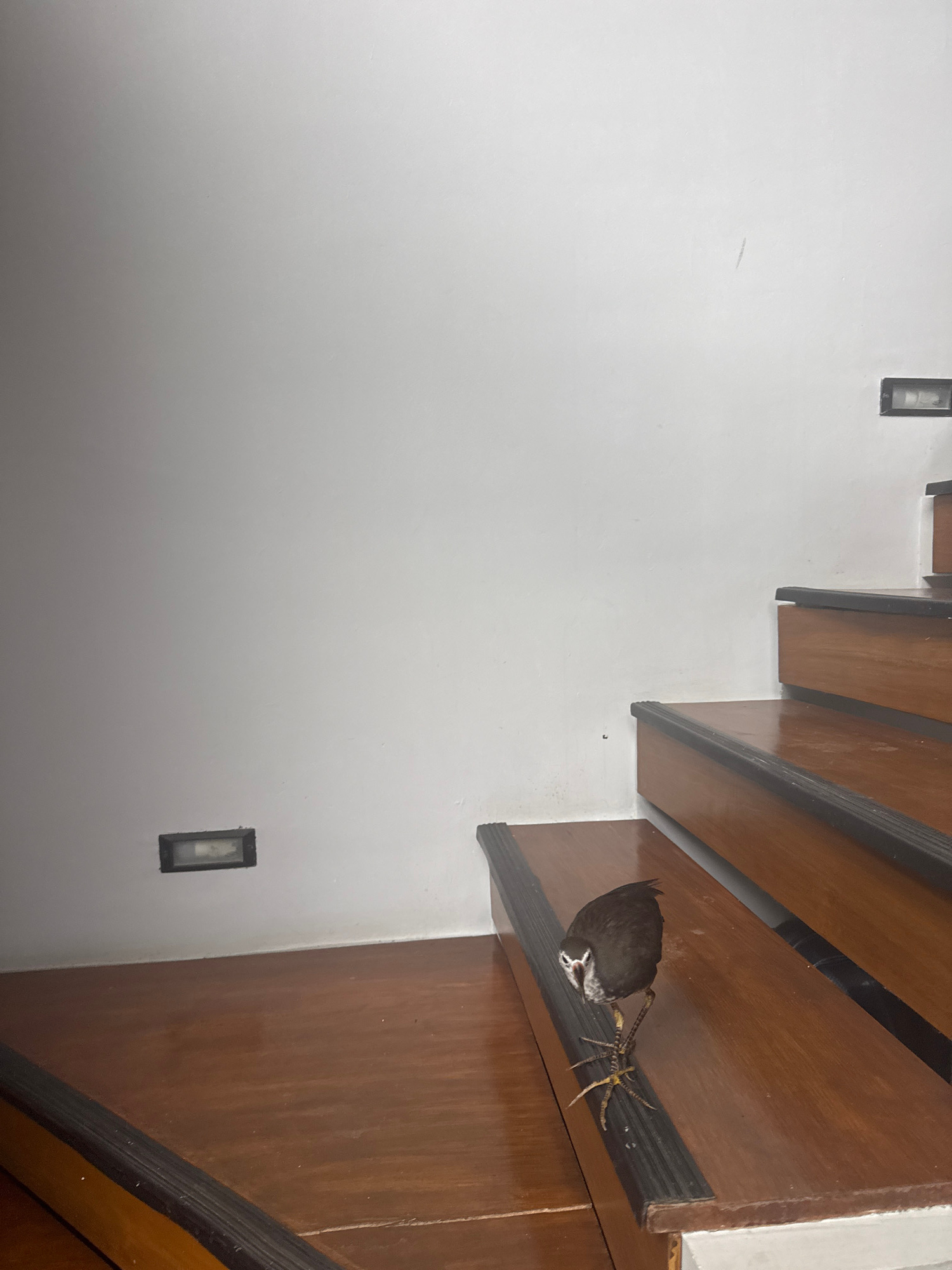A bird is on the edge of a staircase in Unknown, Indonesia. The staircase is made of wood and has black trim. The bird is dark brown with a white beak. Its legs are tan with large feet and it is facin…read more