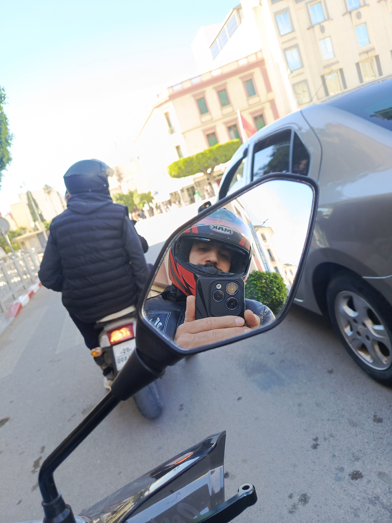 The image presents a first-person perspective from a motorcycle, with a prominent rearview mirror reflecting the photographer. The photographer, wearing a red and black full-face helmet with "DIAM" pr…read more