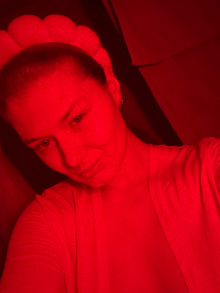 A person lies on their side, illuminated by a strong red light. The head rests on a pillow or cushioned surface. The face is visible, with eyes open and a slight smile. The person wears a cloth-like g…read more