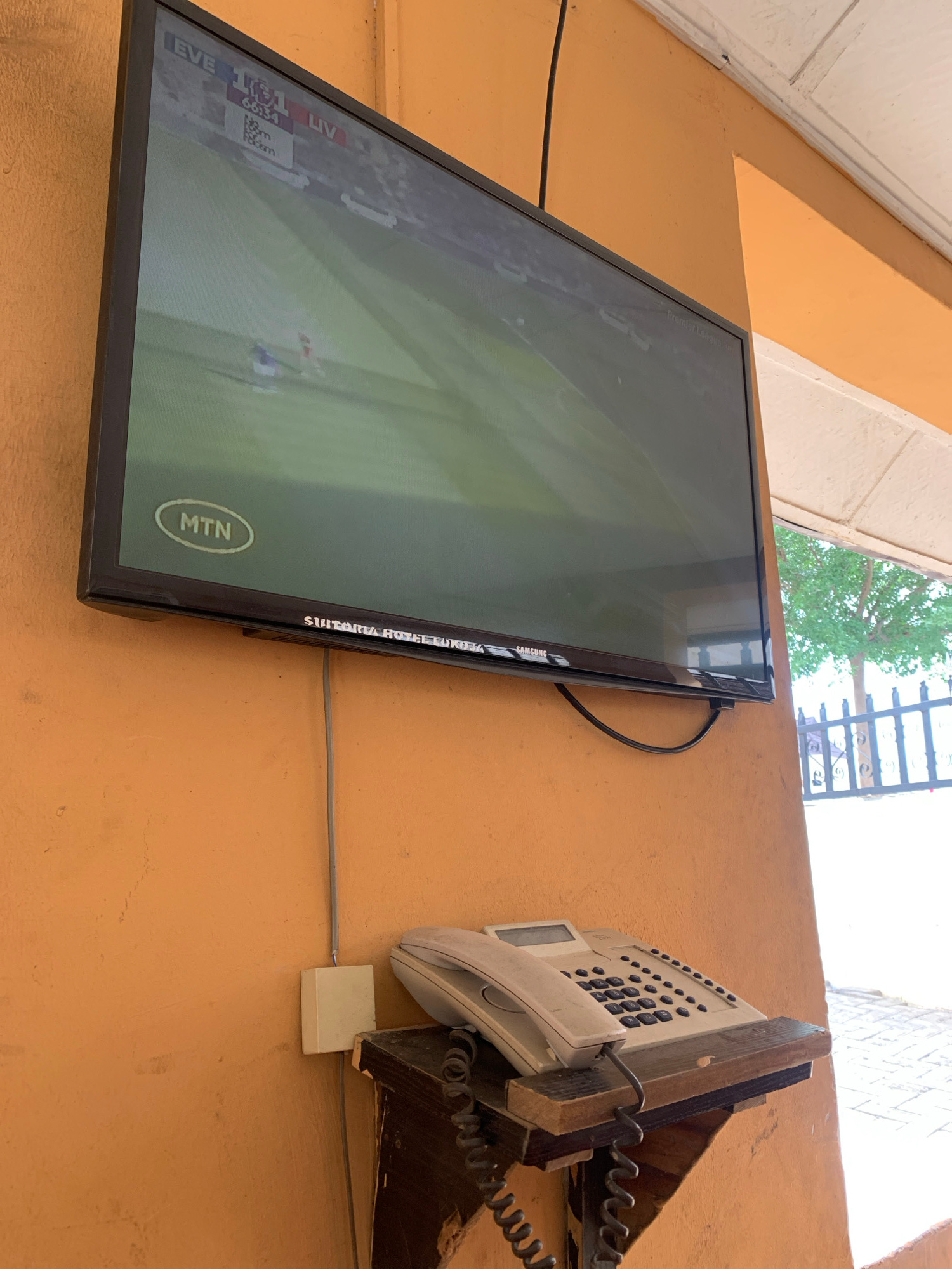 A wall in a building in Lokoja, Nigeria, has a flat-screen TV mounted on the wall, showing a soccer game with the MTN logo displayed. Next to the TV is a white office phone mounted on a wood bracket w…read more