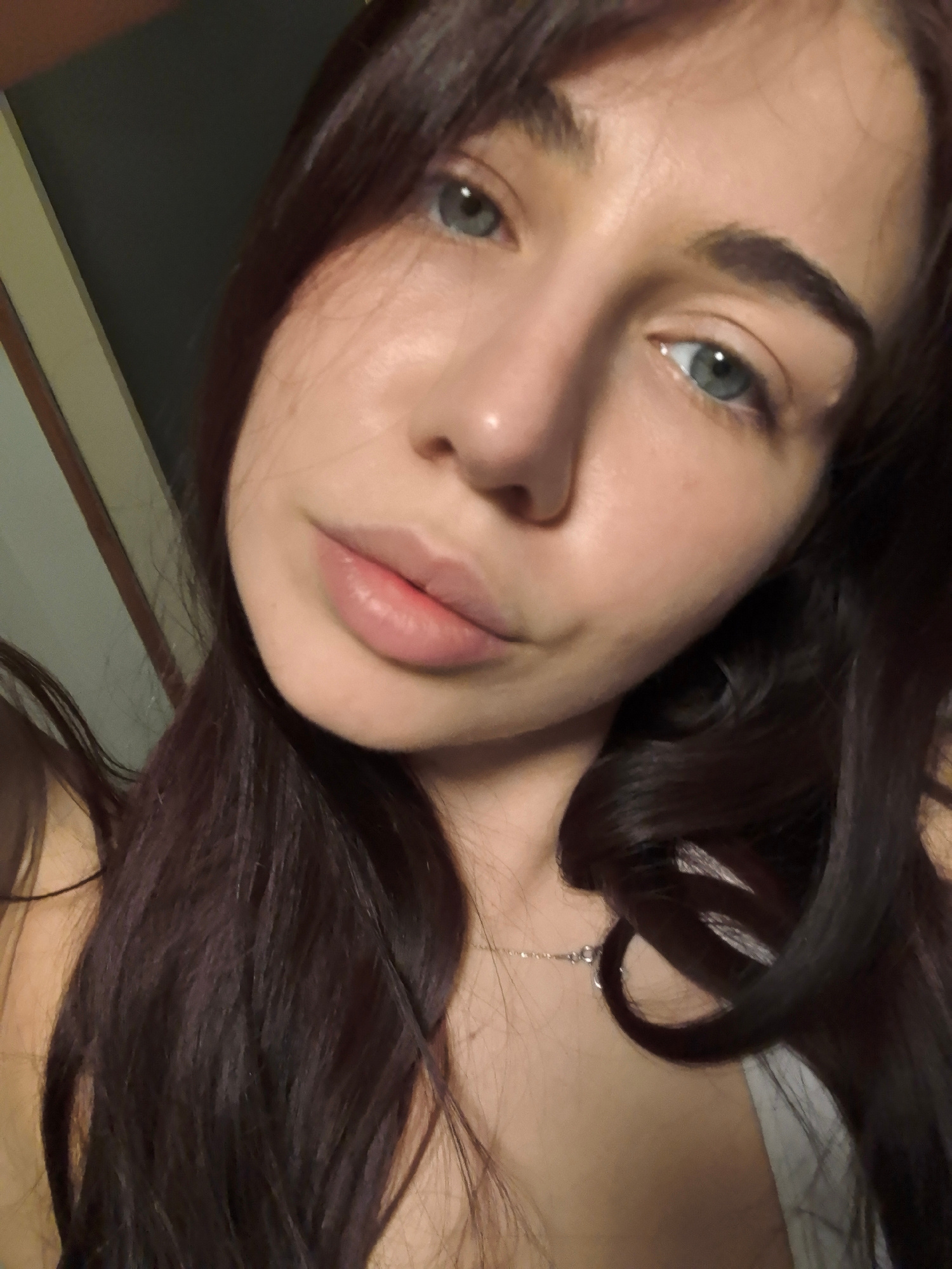 A close-up selfie depicts a young woman with fair skin, striking blue-green eyes, and full lips. She has dark brown hair, some strands of which fall across her face. She is wearing a delicate silver n…read more