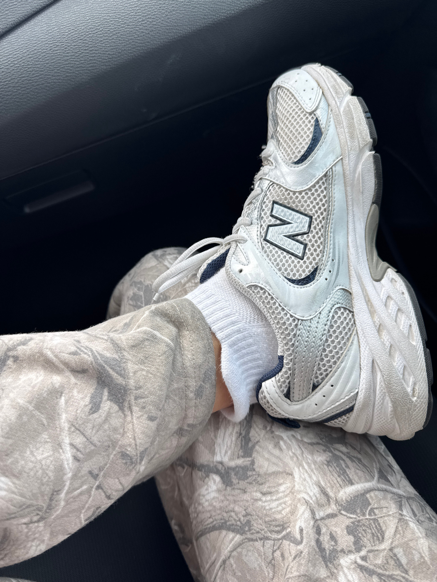 A close-up shot depicts a leg wearing a white athletic shoe with a prominent black "N" logo, white socks, and camouflage pants. The leg is positioned against a dark background, possibly the interior o…read more