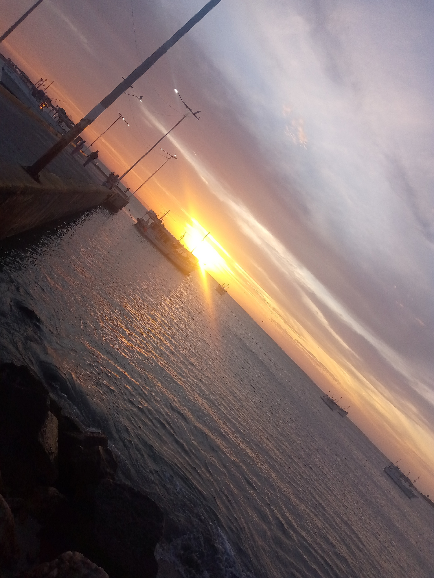 The image captures a sunset scene at a waterfront in an unknown city. The sun is setting over the water, casting a golden glow across the scene. A boat is positioned in the water near the shore, parti…read more