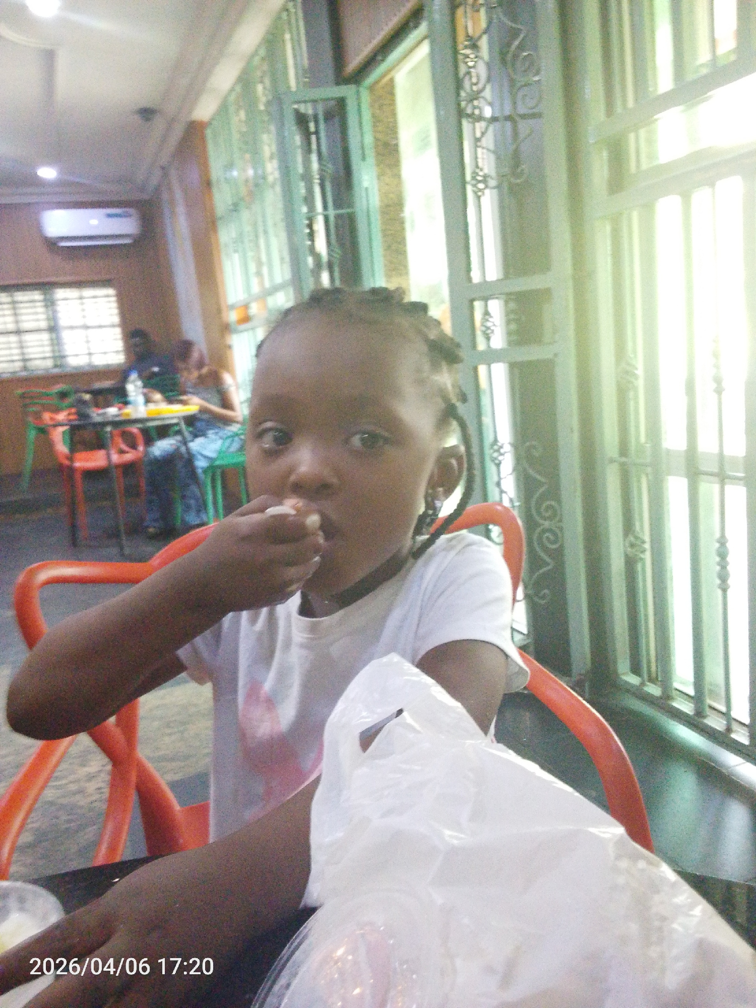 A young girl is sitting at a table in what appears to be a restaurant or food establishment in Lokoja, Nigeria. She is wearing a white t-shirt and eating something held in her hand. There is a white p…read more