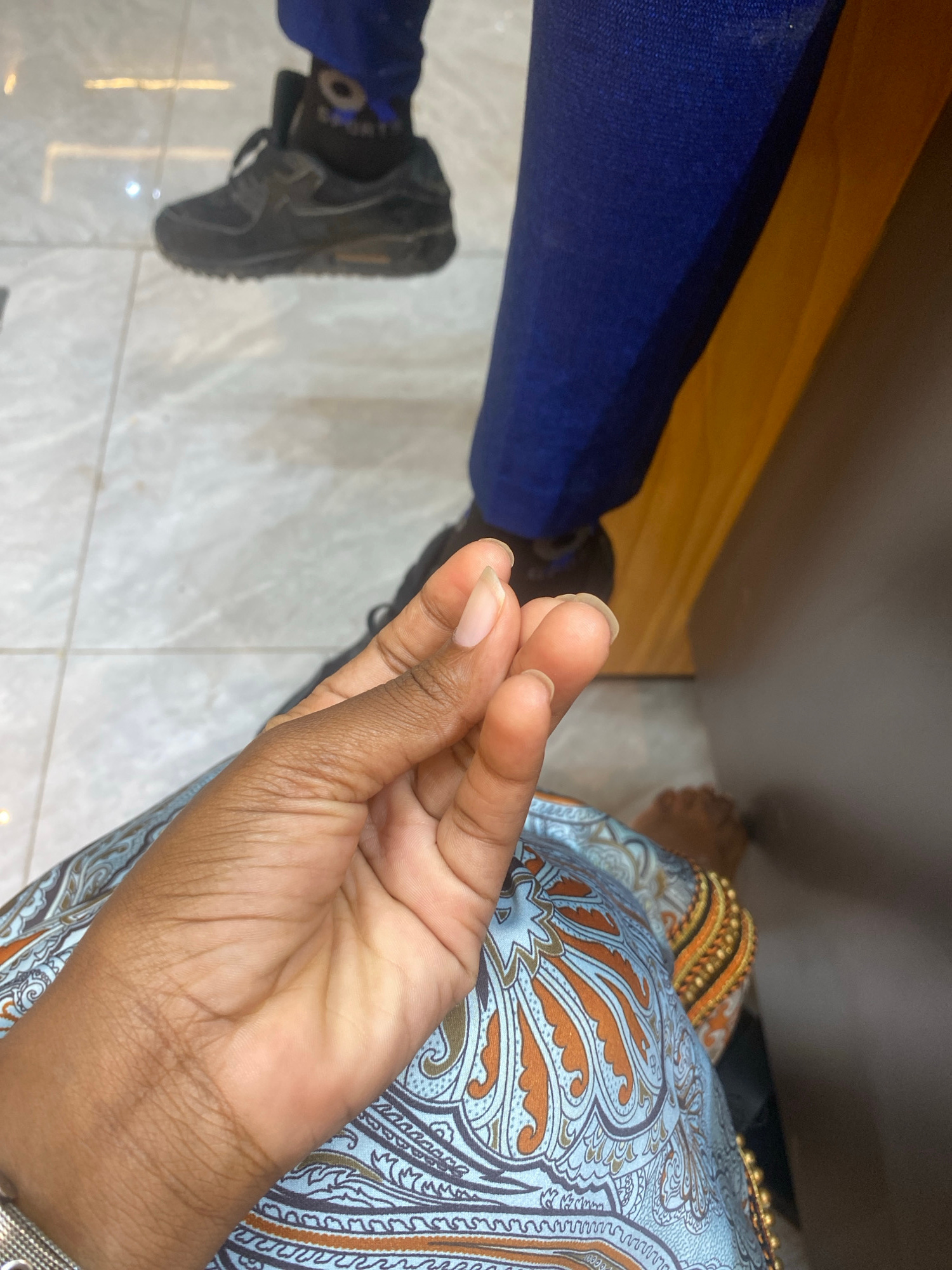 The image shows a scene indoors, likely on a tiled floor. Two individuals are present, partially visible. The individual on the left wears dark grey sneakers, blue pants and is standing near what appe…read more