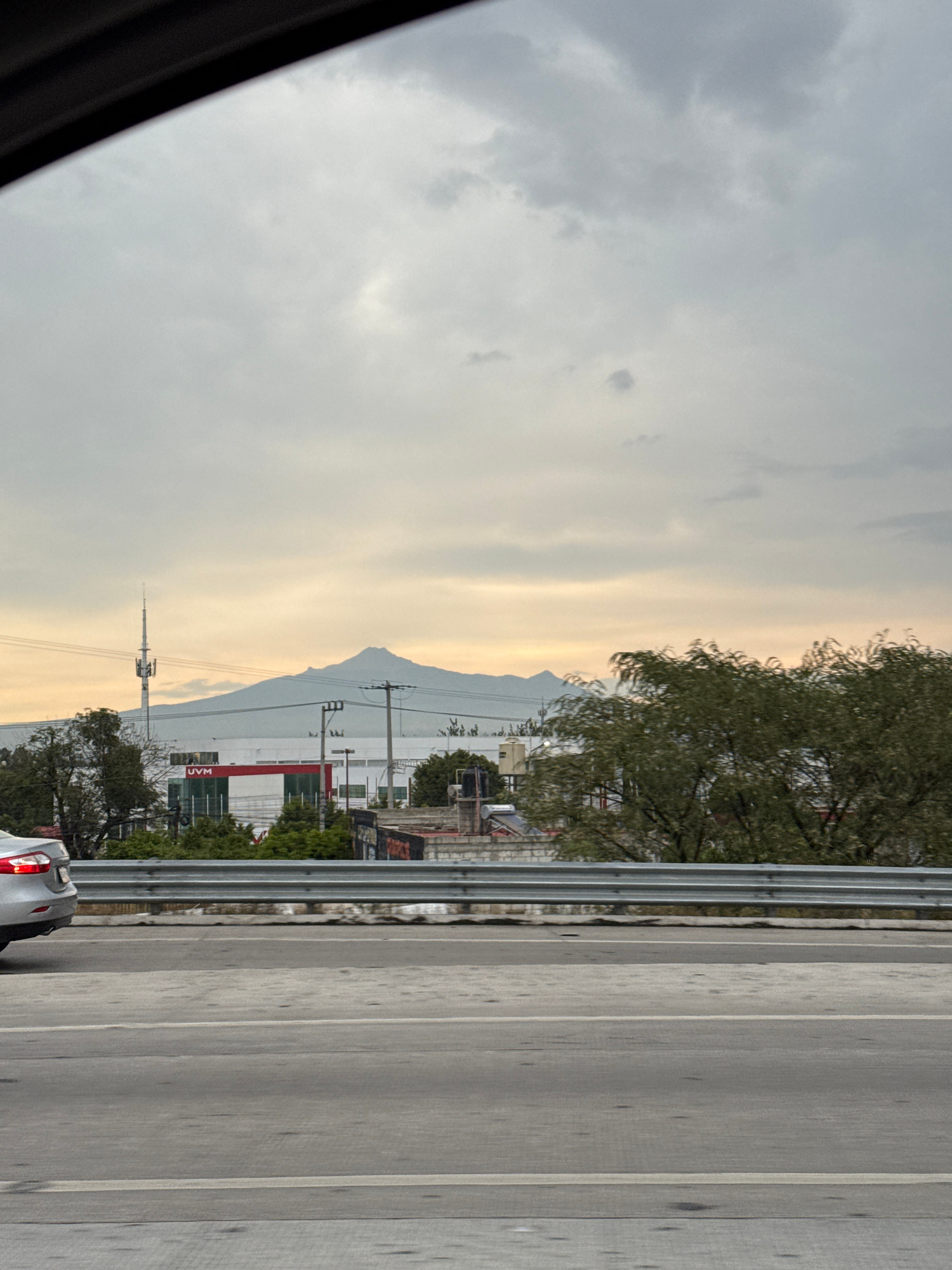 The image, taken from a moving vehicle, shows a view of San Bernardino Tlaxcalancingo, Mexico. In the foreground is a multi-lane road with a metal guardrail. A partial view of a light-colored car is v…read more