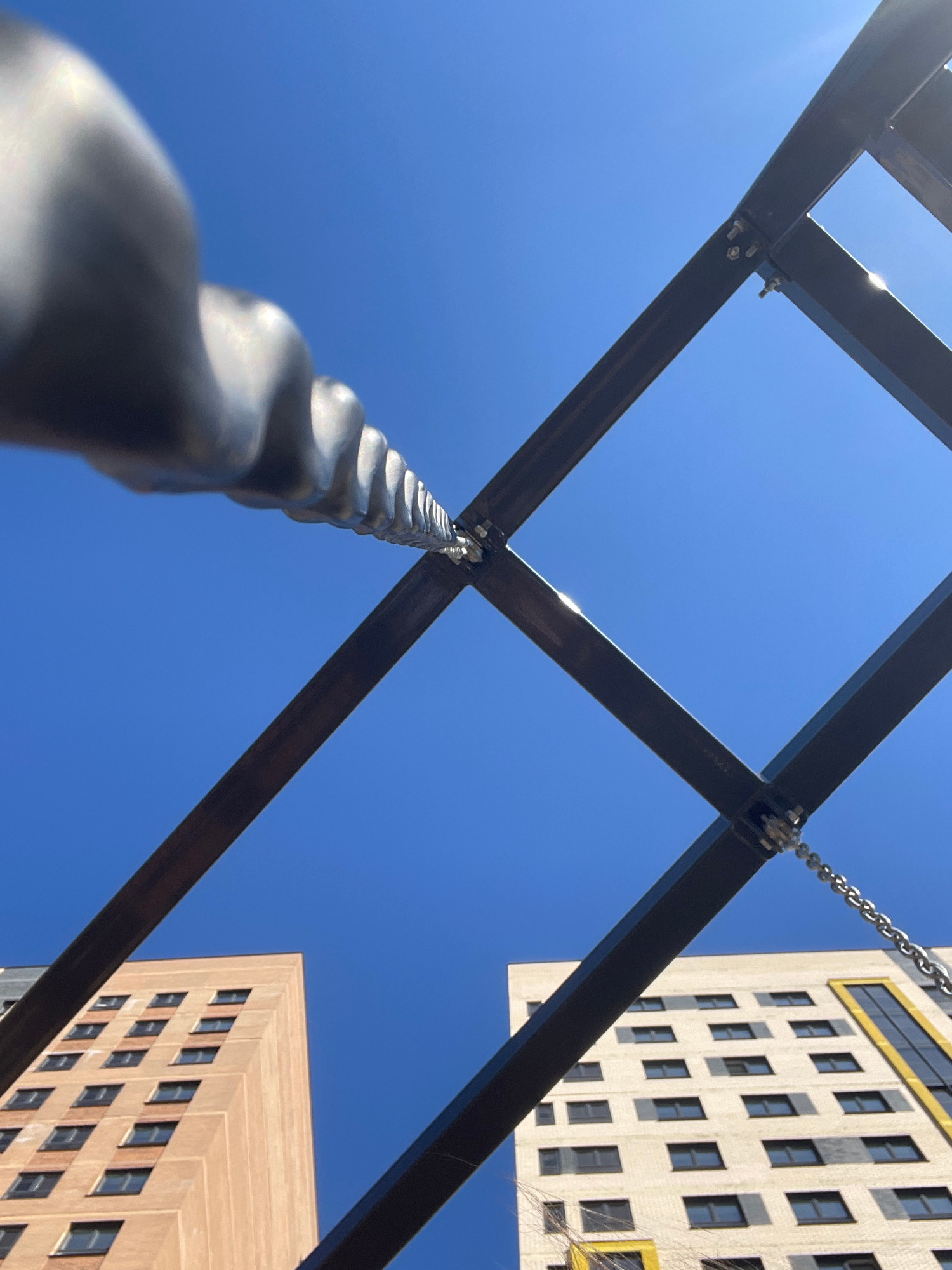 The image presents a low-angle view of a metal structure with a chain, set against a clear blue sky. Two buildings with multiple windows are visible in the background. The metal structure appears to b…read more
