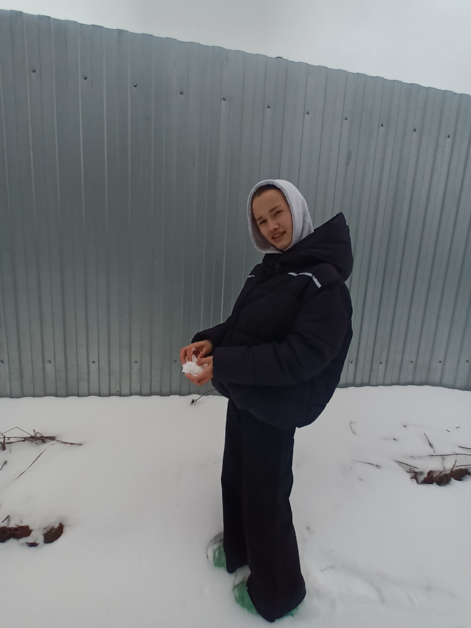 A person wearing a grey hooded sweatshirt underneath a black puffy jacket and dark pants stands in the snow near a grey corrugated metal fence. The person is holding a snowball in their hands. The sce…read more