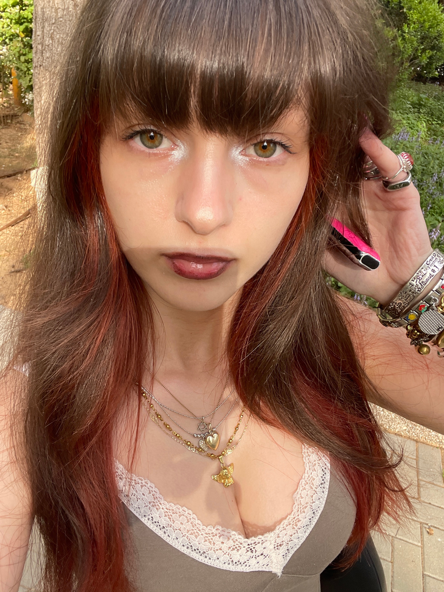 A woman with brown hair and red highlights, wearing multiple silver bracelets, is visible. She has light skin, brown eyes, and is wearing makeup. She is wearing a light-colored top with lace trim and…read more
