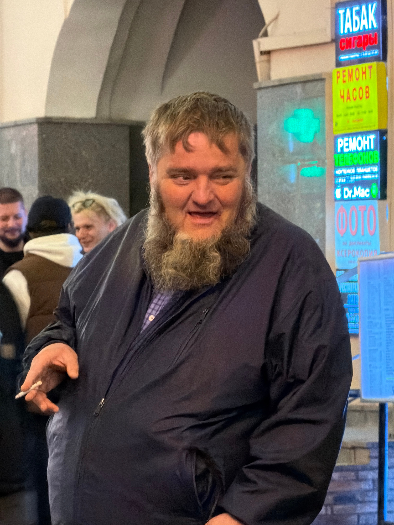 The image shows a man with a gray beard and light brown hair, slightly disheveled, holding a cigarette in his right hand. He is wearing a dark blue jacket over what appears to be a collared shirt. Beh…read more