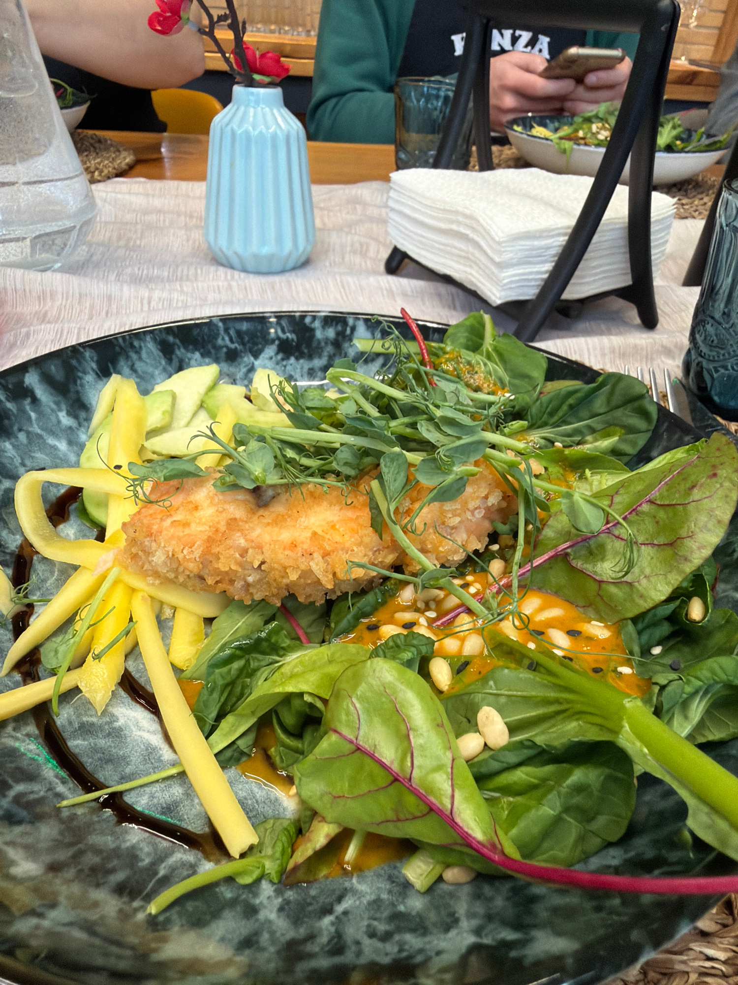 The image depicts a plate of food, possibly a salad, featuring greens, what appears to be fried fish, mango slices, and various other ingredients, placed on a dark, marble-patterned plate. There's als…read more