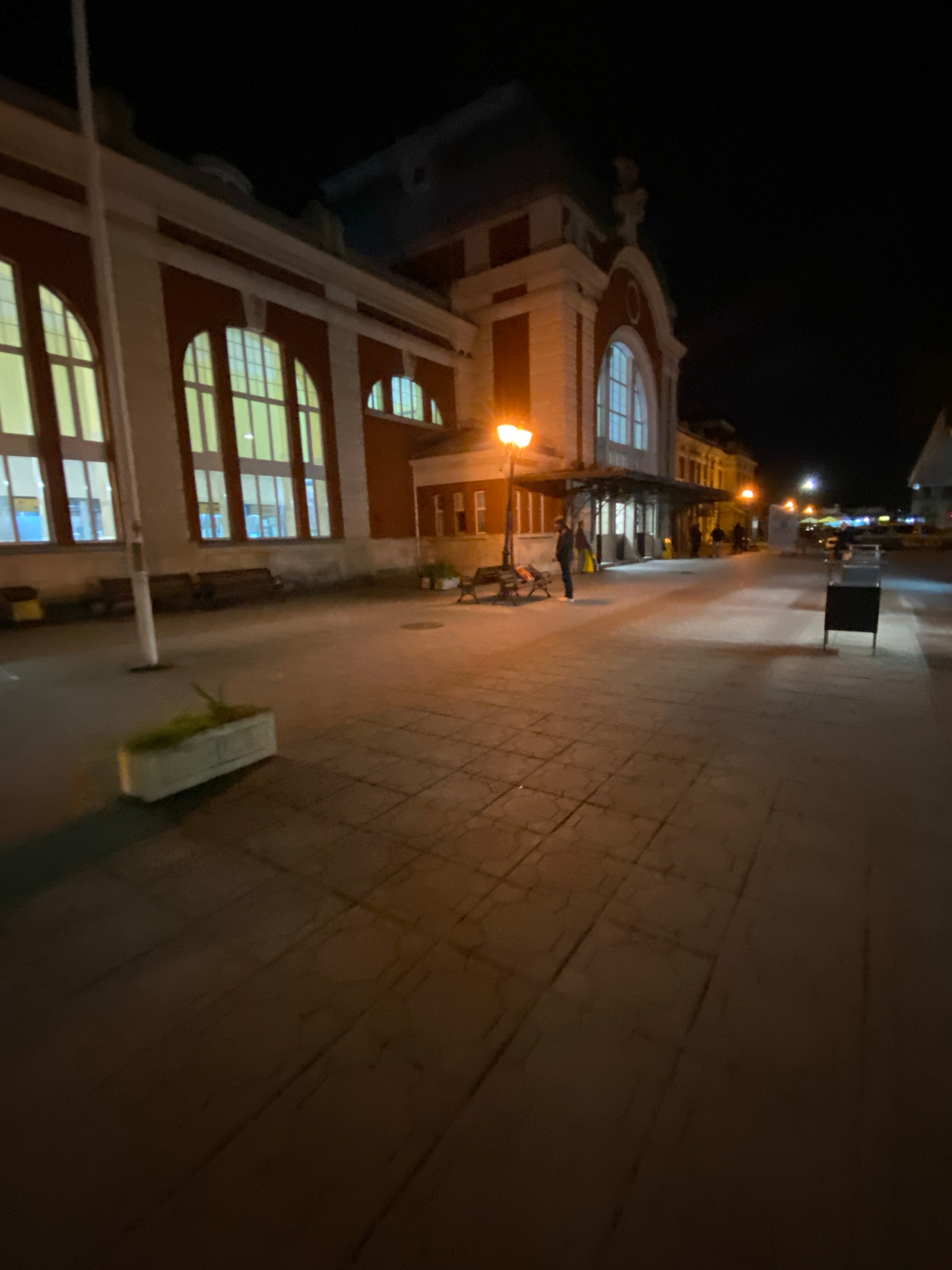 The image shows the Varna Central railway station, Bulgaria at night. The building is brick with white trim. Large arched windows are visible. The foreground shows the pavement with street lights. Peo…read more