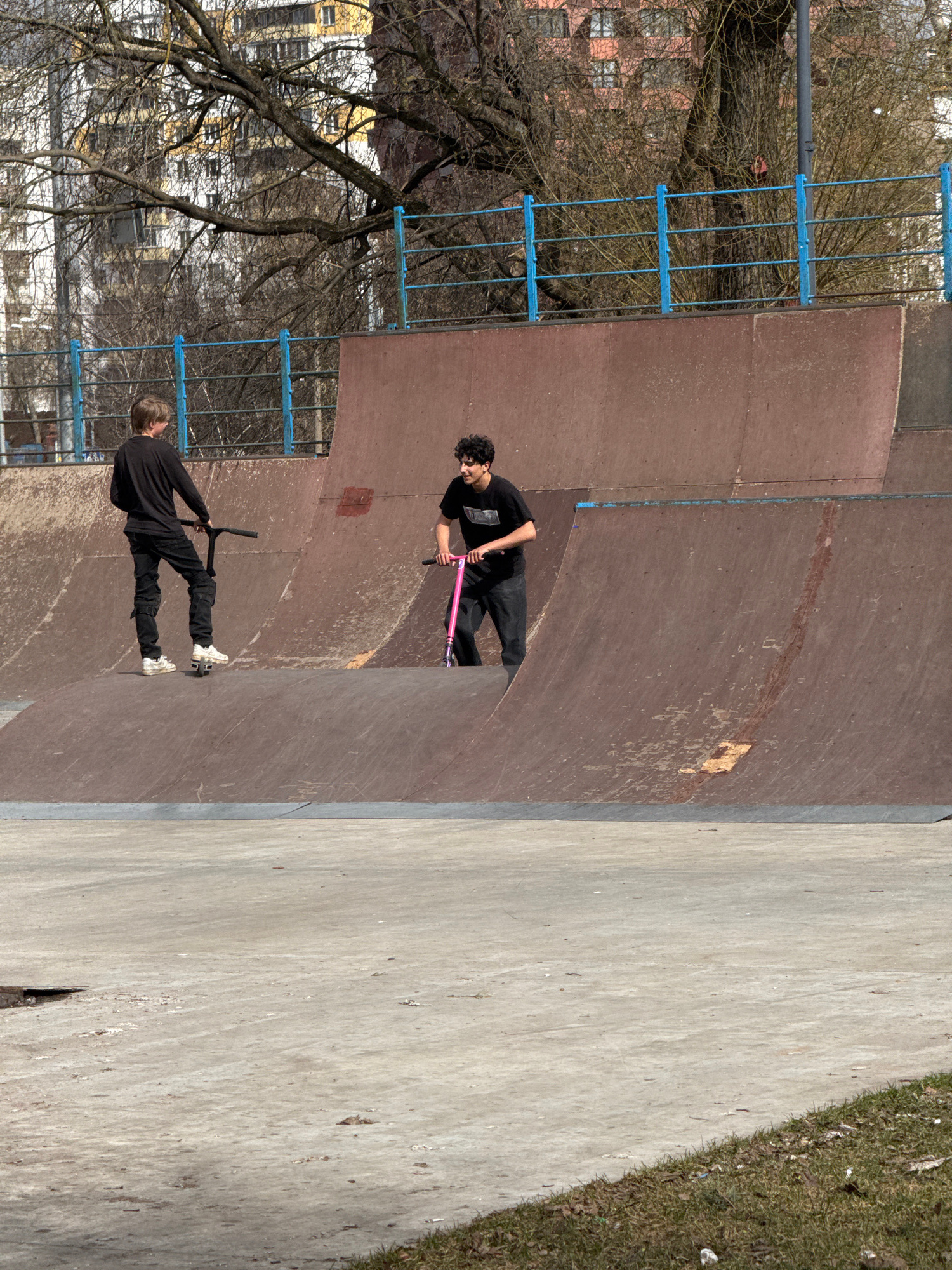 Two people are skateboarding in a skatepark. One person is near the top of the ramp with a pink skateboard. The other person is near the bottom of the ramp with a black skateboard. Behind the ramp is…read more